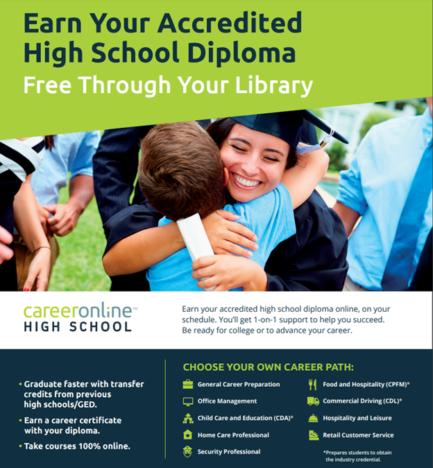 Through a partnership with Career Online High School (COHS), the Kern County Library supports adults with earning their high school diploma and a career certificate. The library grants scholarships as part of their adult education programming. The fully online high school program provides a 24/7 online classroom, personal academic coaches, and real-world career training.