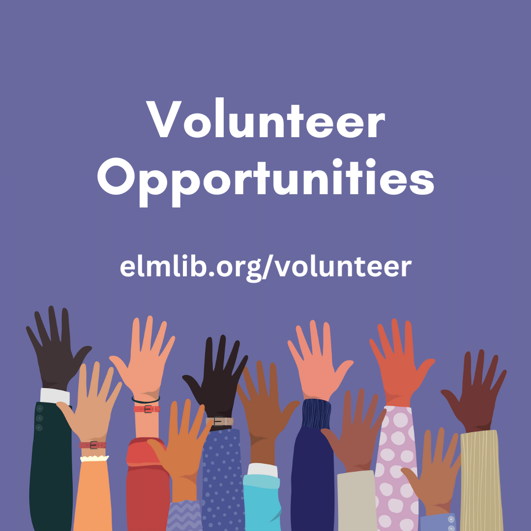 Middle School Volunteer opportunities for spring run March 9 – April 19 with a commitment of one hour each week. Assist with programs, crafts, and organizing the Kids' Library. Apply until Feb. 28 at elmlib.org/volunteer.