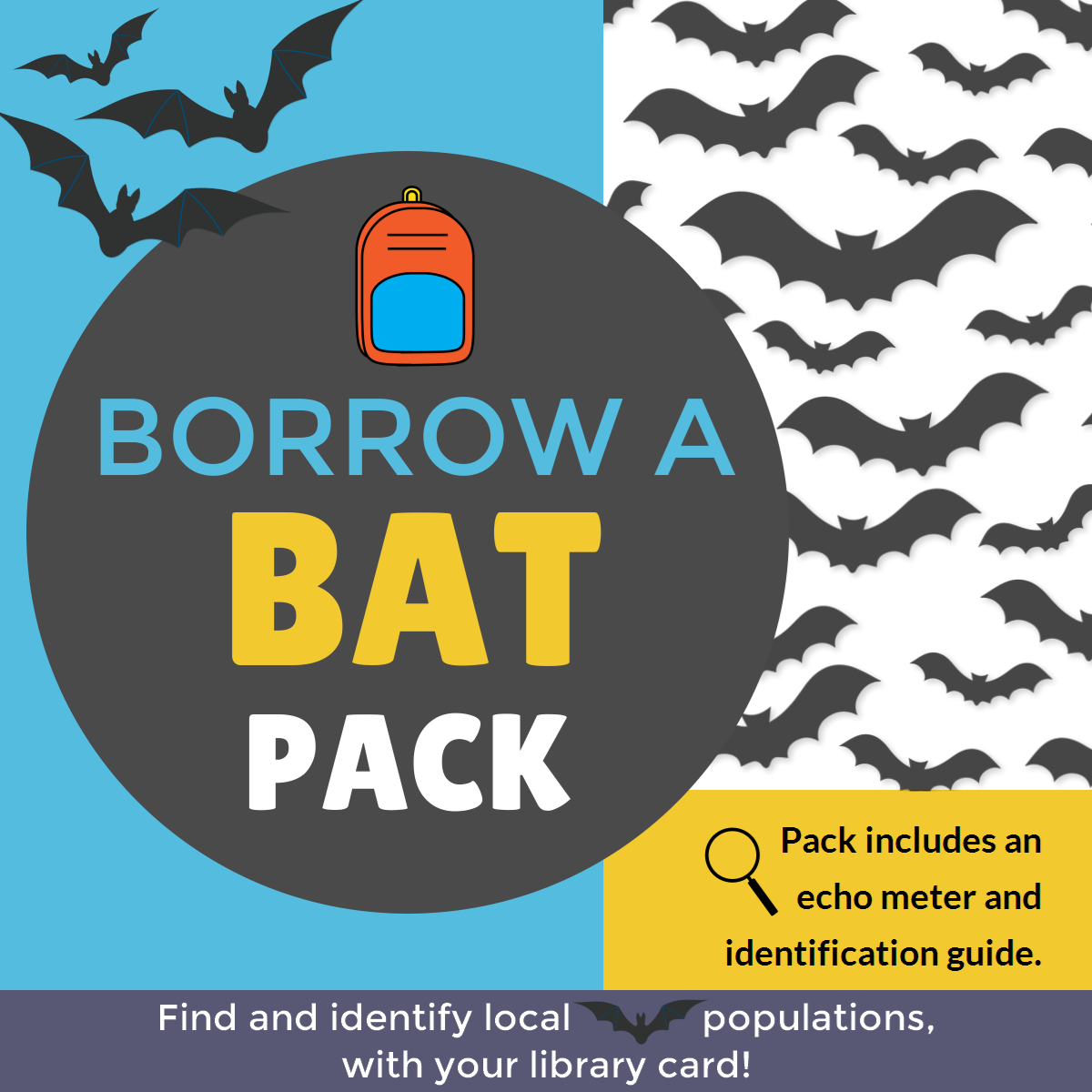 Find some bats! With our Batpack, you can locate and identify local bat populations. The pack includes an echo meter (compatible with Android devices), identification guides, a real bat skeleton (so tiny!), and a backpack. Available to borrow from the library—come in and we'll get you started!