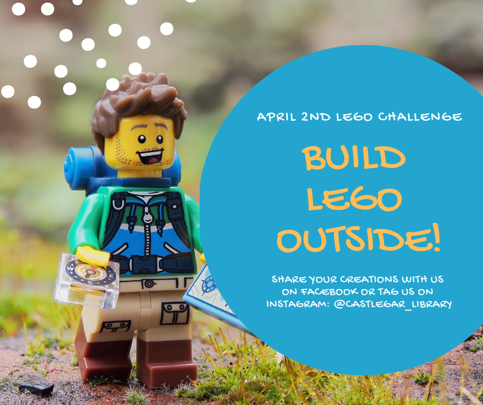 This week's challenge is: Build LEGO outside! Make a scene with your LEGO somewhere outside. In a tree, on your porch/deck, on the grass, etc. Snap a photo and share it with them on their facebook page or you can tag them on Instagram at @castlegar_library.