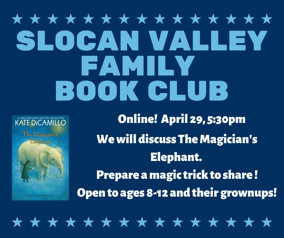 Family Book Club Who wants to spend an evening chatting about one of the best books ever (Kate Dicamillo's The Magician's Elephant) and watching a magic show? If that is your idea of a good time, please join us! And be prepared to share a magic trick! Find the book on our ebook app called Libby. If you haven't read the book, you can still join us! This is an initiative of both the Nelson Public Library and Columbia Basin Alliance for Literacy - Slocan Valley. Here are the details for connecting.