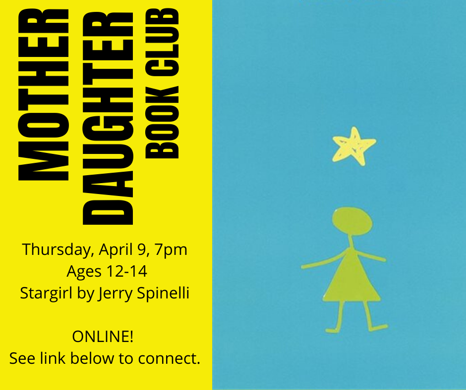 Mother Daughter Book Club Mother Daughter Book Club will be meeting online to discuss Jerry Spinelli's book STARGIRL. Feel free to join us if you have read the book, which is available as an e-book on Libby. If you haven't read it, you are still welcome to join us! Click here for how to connect.