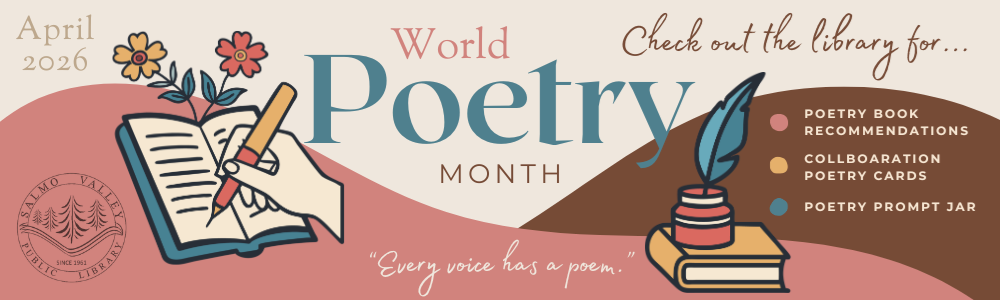 National Poetry Month April is National Poetry Month, and the Salmo Valley Public Library invites our community to celebrate the power of words. The 2026 theme, “Land & Sea,” announced by the League of Canadian Poets and Native Women in the Arts, explores our connection to the earth and water and our shared responsibility to care for the natural world. This month, visitors are invited to contribute to our Collaborative Poem Wall, inspired by the idea that every voice has a poem.