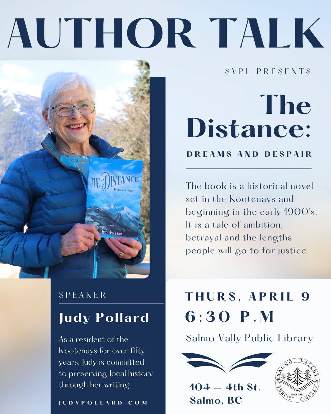 Author Talk: Judy Pollard The Salmo Valley Public Library is pleased to welcome local author Judy Pollard for a special Author Talk featuring her historical novel The Distance: Dreams and Despair. Set in the Kootenays in the early 1900s, the book explores themes of ambition, betrayal, and the lengths people will go to in pursuit of justice. Join us on Thursday, April 9th at 6:30 PM at the Salmo Valley Public Library for an engaging evening of storytelling and conversation. You can learn more about this event on our website and read more about Judy at judypollard.com.