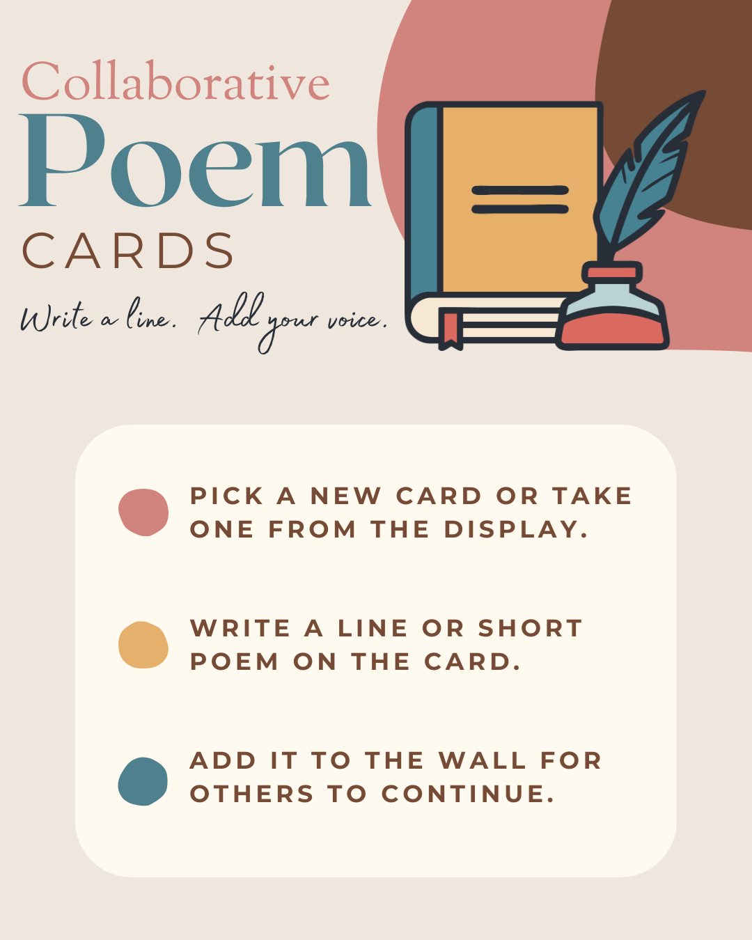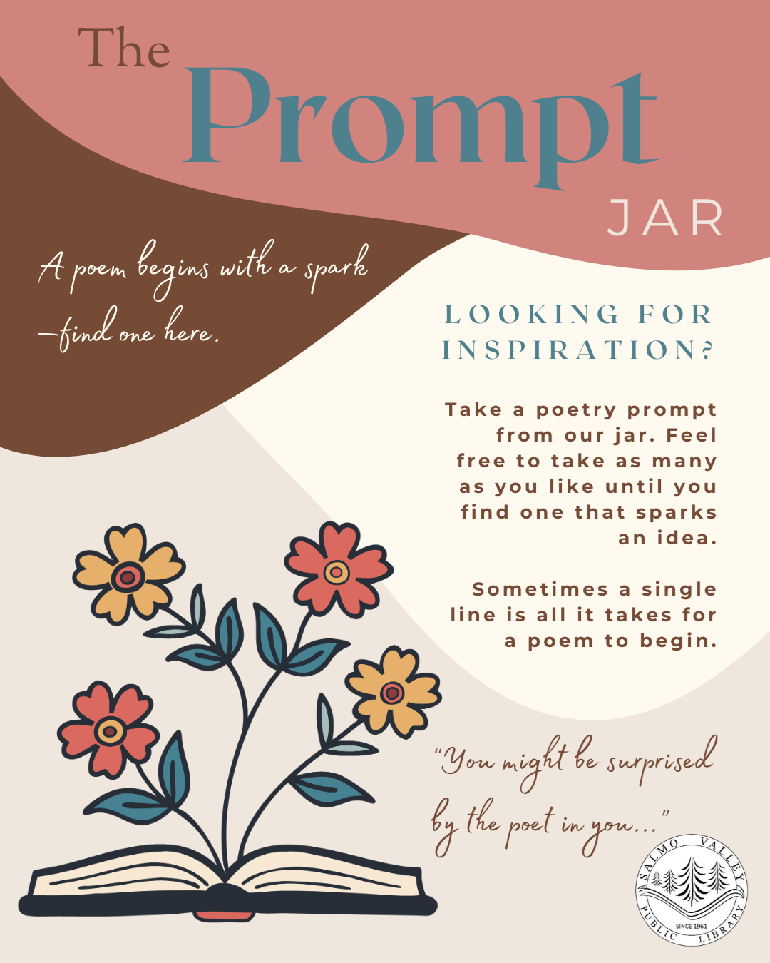 Pick a card, write a line or short poem, and add it to the wall so others can continue. As the month goes on, these individual lines will grow into a community poem shaped by many voices. Need a spark of inspiration? Visit our Poetry Prompt Jar and take a prompt—or a few—until one sparks an idea. Sometimes a single line is all it takes to begin. Feel free to explore Poetry Month in whatever way feels right for you. If you’re not sure where to begin, ask our library staff for poetry recommendations. You might be surprised by the poet in you.