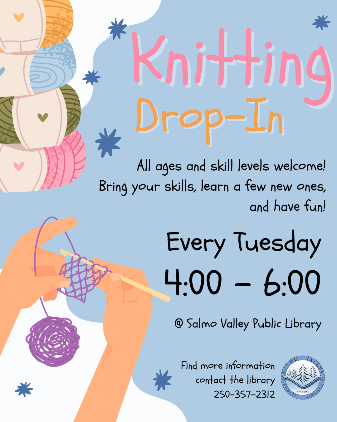 Drop-In Knitting Group Whether you’re a seasoned knitter or picking up needles for the very first time, all ages and skill levels are welcome. This is a casual, self-guided gathering — not an instructor-led program — where participants can bring their current projects, share skills, learn from one another, and enjoy some creative time together. Join us every Tuesday from 4:00–6:00 pm at the library for a relaxed and friendly meetup. No registration required — just drop in and knit!