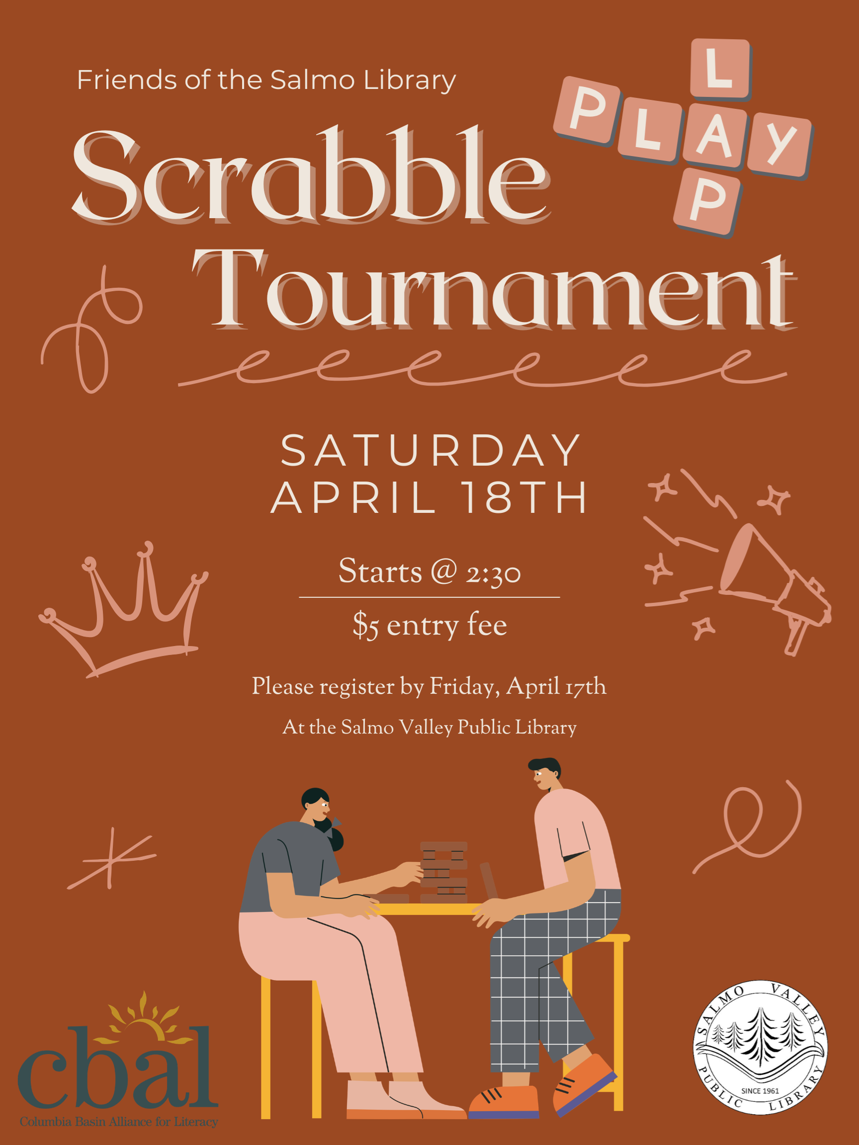 Scrabble Tournament We’re excited to announce an upcoming Scrabble Tournament for word lovers of all levels! Join us on Saturday, April 18th at 2:30 PM for a lively competition where creativity, strategy, and a love of language take center stage. The tournament will have a $5 entry fee, and all participants must be registered by Friday, April 17th. We look forward to seeing you there for an afternoon of words, laughter, and a little friendly competition!