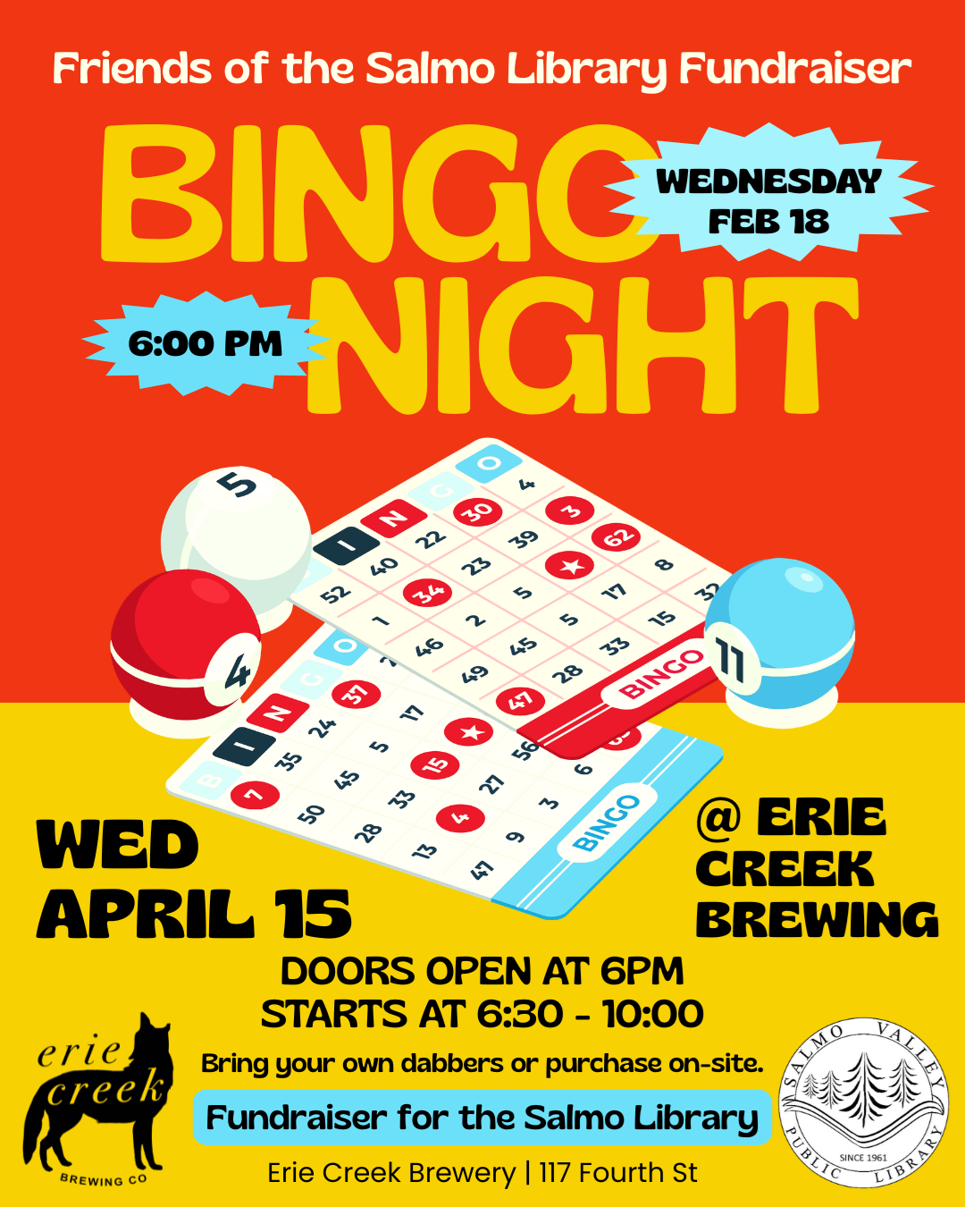 Friends BINGO Fundraiser Join the Friends of the Salmo Library for a fun Bingo Night Fundraiser at Erie Creek Brewery! Enjoy an evening of classic bingo, great company, and community spirit while supporting your local library. Whether you’re a seasoned player or brand new to the game, it’s sure to be a lively and welcoming night out. The event takes place Wednesday, April 15 at Erie Creek Brewery (117 Fourth Street). Doors open at 6:00 PM, with bingo starting at 6:30 PM. Food and drinks will be available for purchase, and dabbers can be brought from home or purchased on-site. All proceeds support programs and services at the Salmo Valley Public Library.