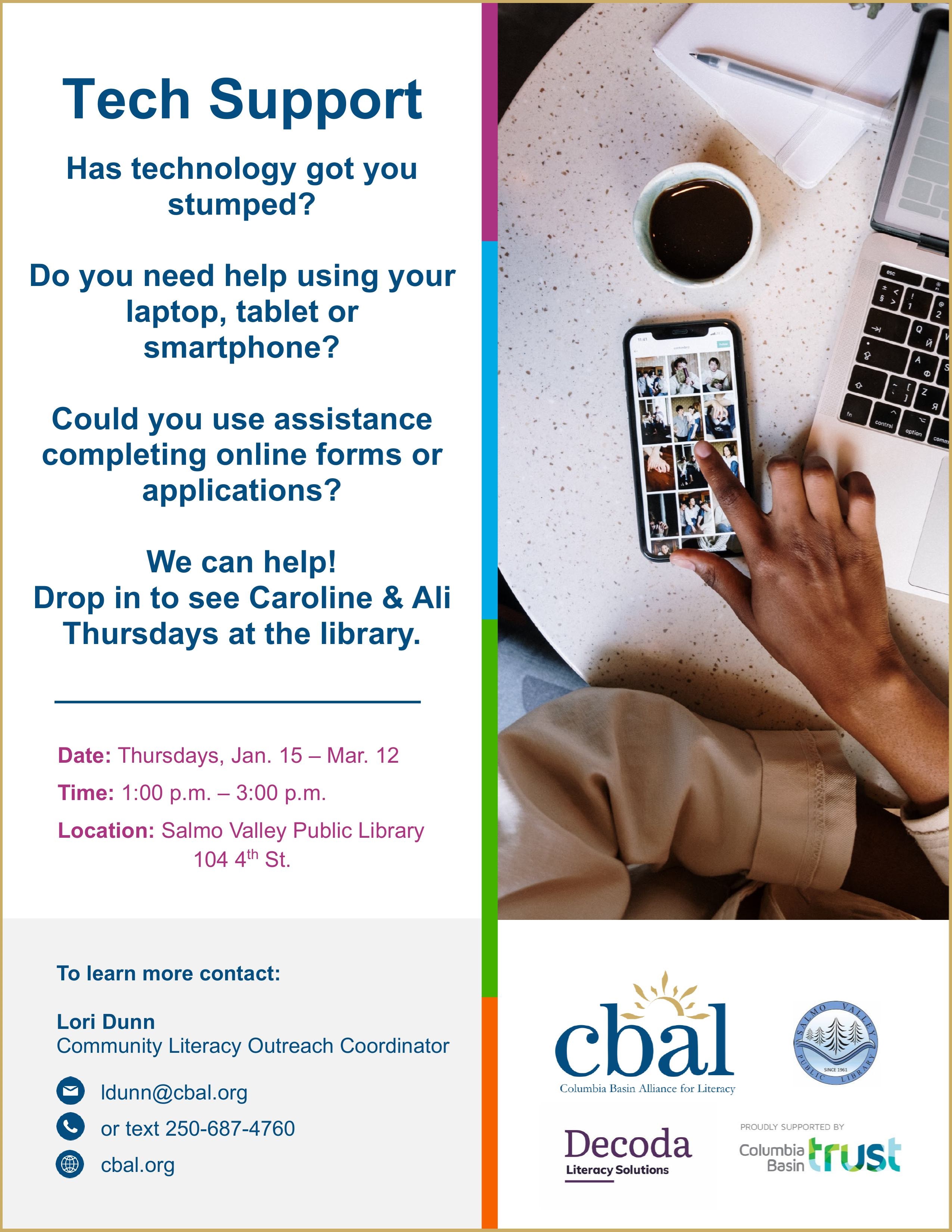 Tech Support Get free, one-on-one help with your smartphone, tablet, laptop, or other digital devices. Our friendly staff provide a welcoming, drop-in space where you can learn at your own pace—whether it’s sending emails, using apps, managing settings, or accessing online services. No question is too small! Thursdays, April 9 – May 28 | 1:00–3:00 pm For more information, contact Lori Dunn, Community Literacy Outreach Coordinator, at ldunn@cbal.org, text 250-687-4760, or visit cbal.org.