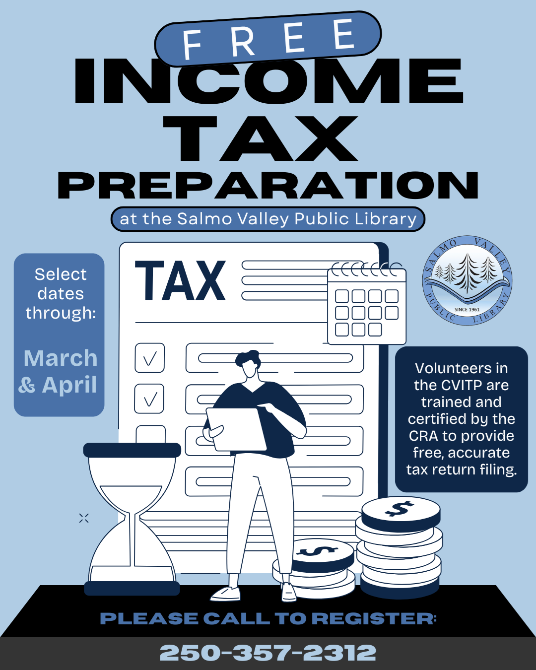 Free Income Tax Clinics The Community Volunteer Income Tax Program is back this spring! Trained volunteers will be offering free tax help to eligible individuals at the library throughout April. Bring your tax slips and receipts, and be sure to register in advance. Space is limited, so please call the library at (250) 357-2312 or swing by to sign up.