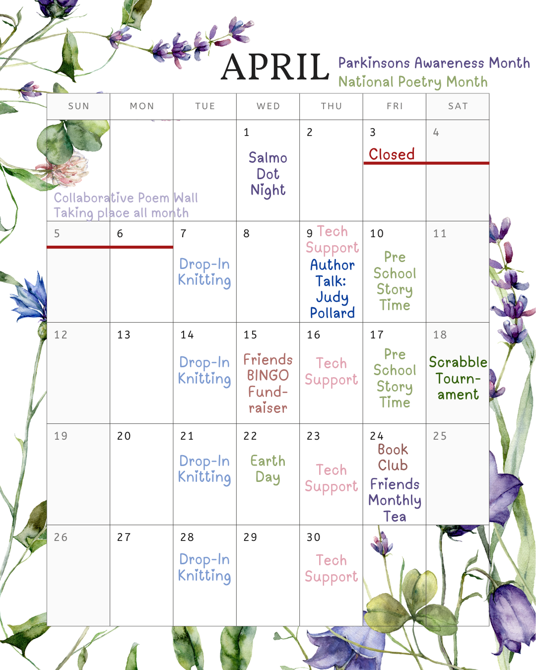 Community Calendar Stay in the loop with our Community Calendar! Where we share what's happening at the library and around town. Have an event of your own? Submit it to the calendar and help spread the word! Click here to check it out on our website.