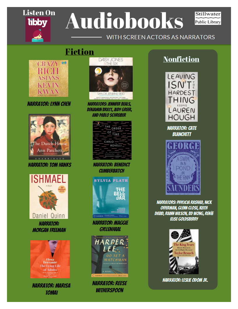 With the Libby app, download free listening materials from the library to your phone. Select from more than 56,000 eAudiobooks! You can sort by popularity, genre, author, and what's available now.