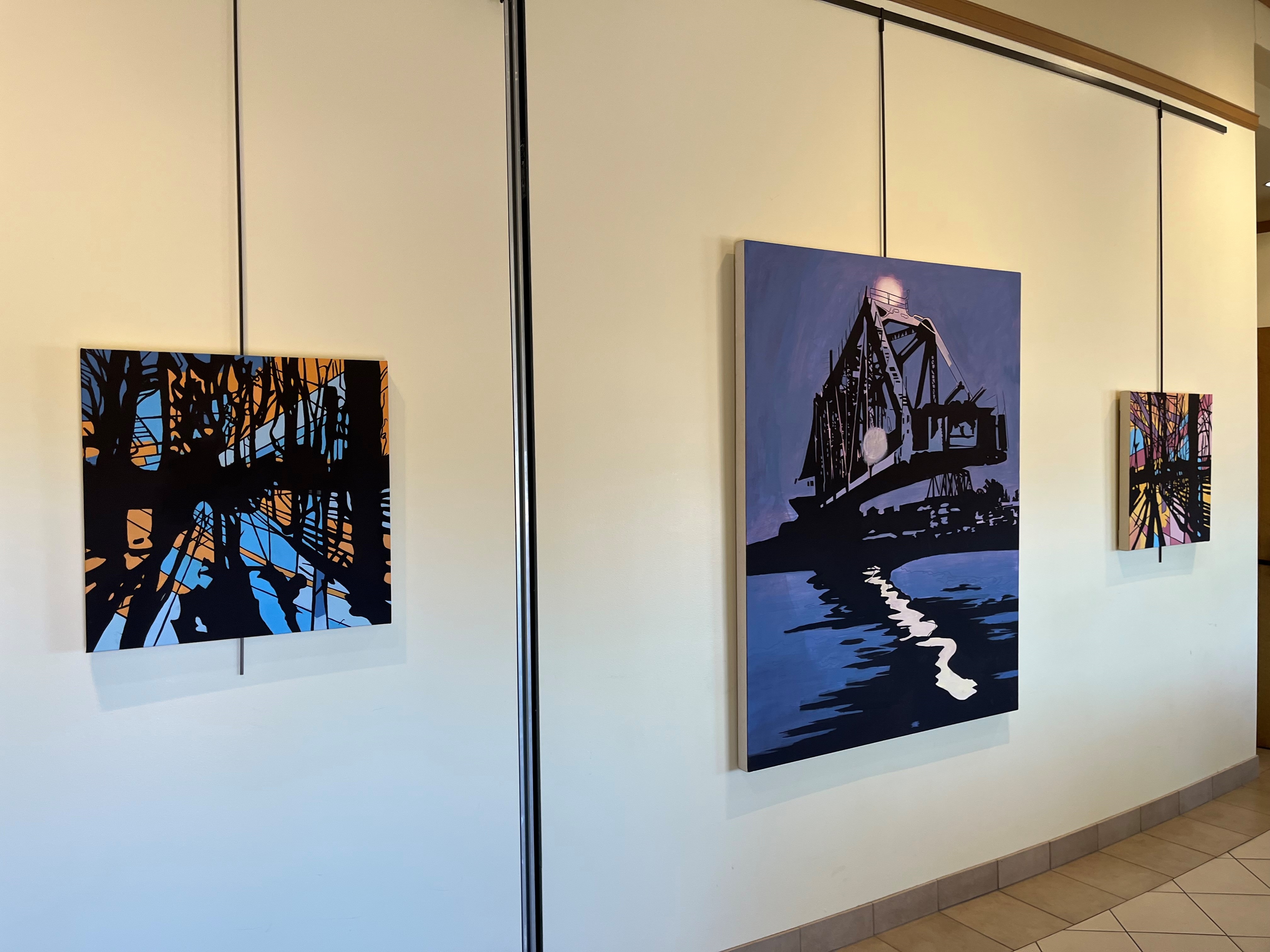 Experience the bold art of Michael Slagle, on exhibit at the library in August and September. "My paintings are based on the landscapes of my neighborhood in Lakeland, compositions I have encountered on my daily routine: walking the dog, out and about with my kids, etc. If I spot an interesting composition I will either take a picture or draw it, or both, and manipulate the image in Photoshop. Using Photoshop I flatten areas in the image, play with the composition, and tweak the colors." Michael then begins painting, bringing the image into a new form on the canvas.