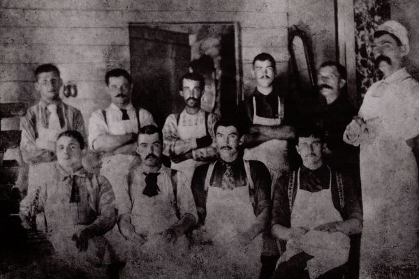 Information with the photo reads: "The cooks in the cook-house of the St. Croix Boom Company at Stillwater, Minnesota, on the St. Croix River in 1886. Back row left to right, Tim Harvieux, C. A. Parent, D. Sicard, E. Carufel, O. Payette, Henri Harvieux. Front row left to right, E. Payette, W. Sicard, Wm. Bergeron, F. O. Harvieux. Photo by Ed C. Fisher of St. Paul, Minnesota. Collected by John Runk, photographer, Stillwater, Minn. U.S.A."