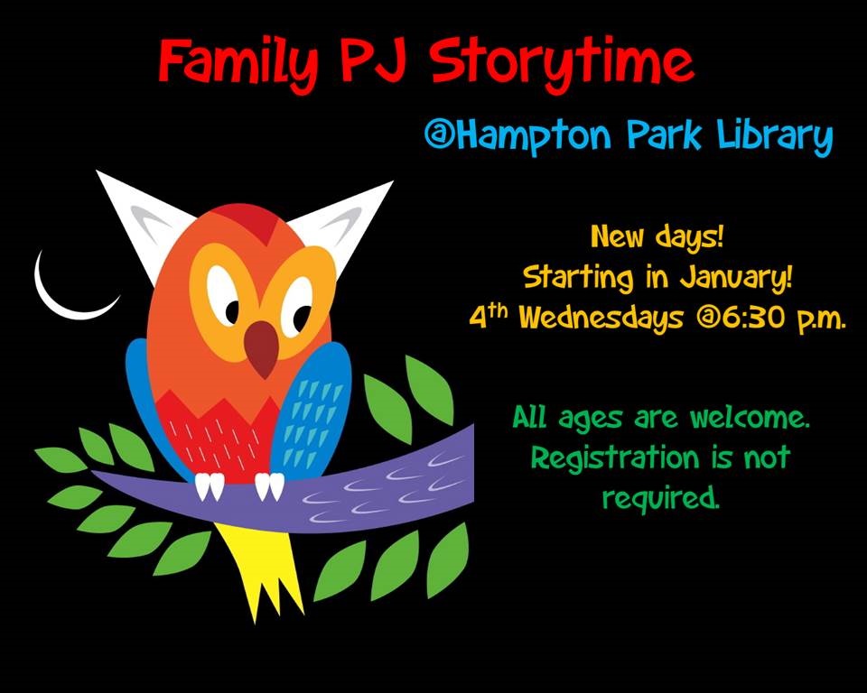 Family PJ Storytime Monday, April 4 at 6:30 p.m. Snuggle in for stories! Join us each Monday evening for books, songs, and activities for the whole family. All ages welcome. Registration is not required.