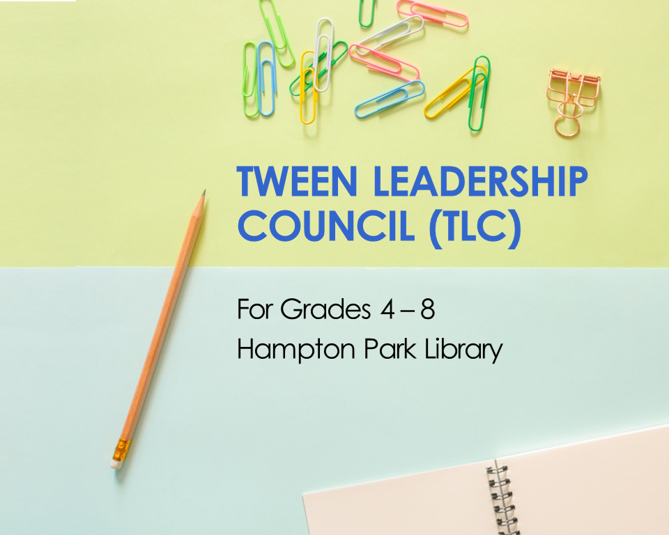 Tuesday, September 25 5:30 p.m. For Grade 4-8 Are you in 4th-8th grade and interested in making a difference in your community? Come join the Hampton Park Library’s new Tween Leadership Council! The TLC will take a leadership role in creating and hosting library programs, planning and assisting with various service projects, and more! Registration is not required.