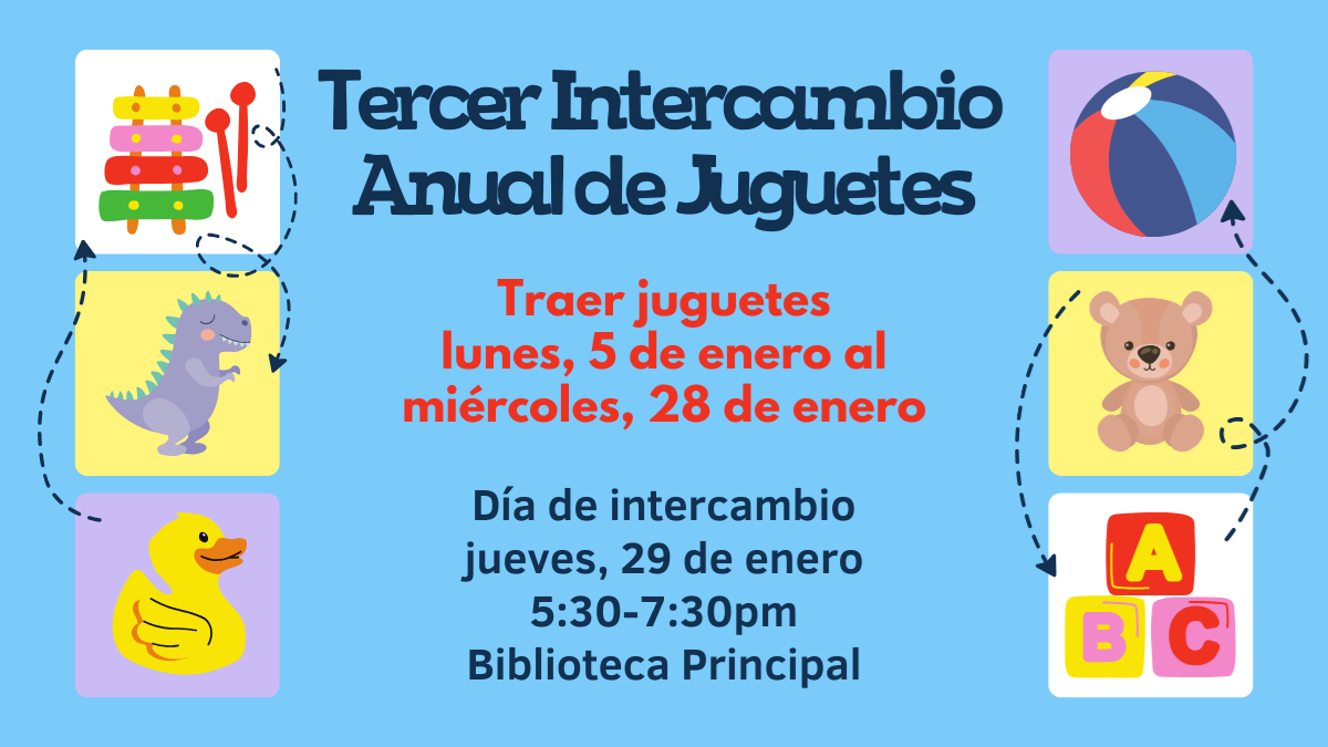 El evento de intercambio de juguetes se llevará a cabo el jueves, 29 de enero de 6:00-7:30pm en la Biblioteca Principal. TODOS los usuarios son bienvenidos al intercambio de juguetes y podrán llevarse a casa un juguete. NO es necesario traer un artículo donado ni un pase VIP para participar.