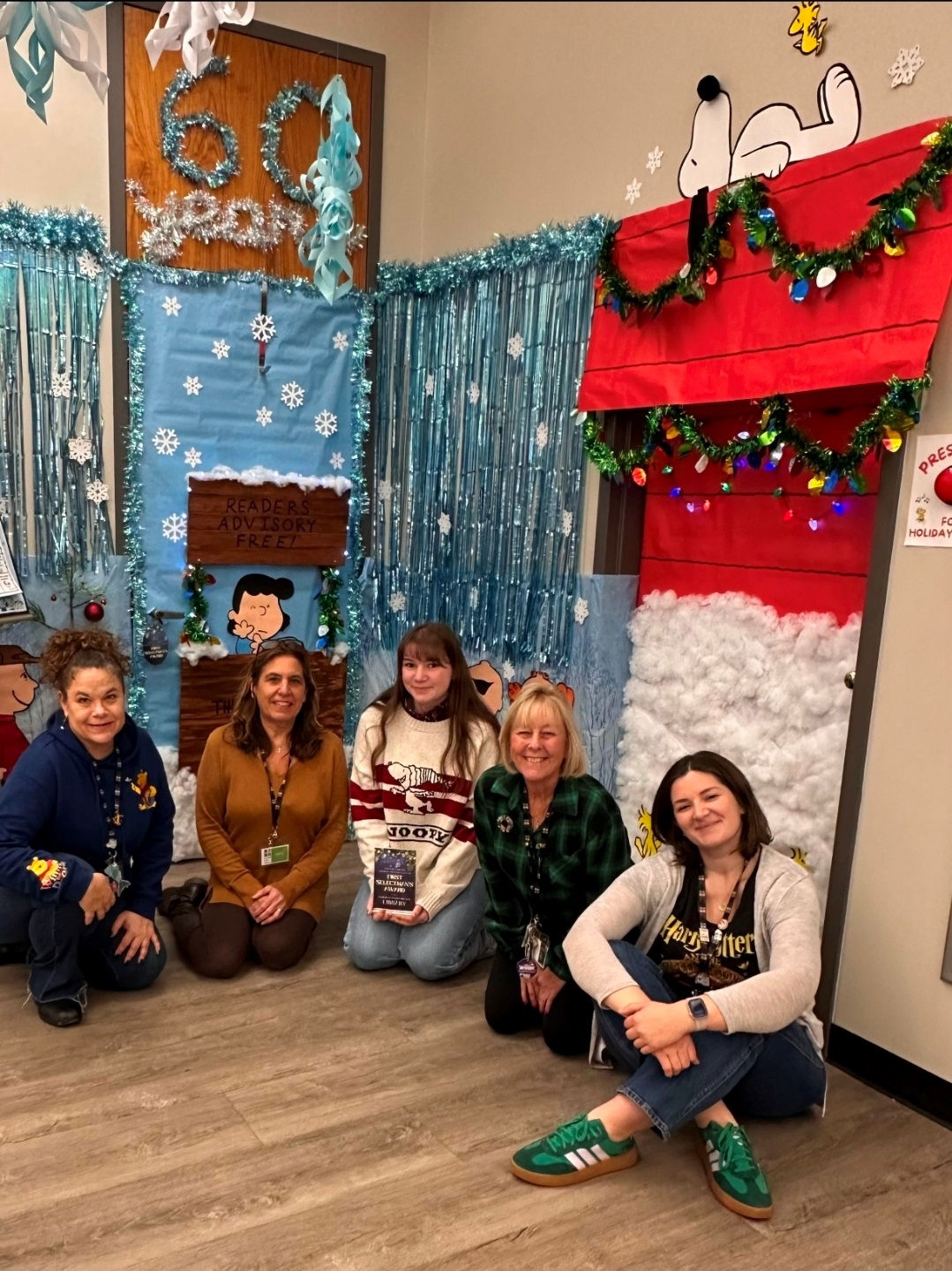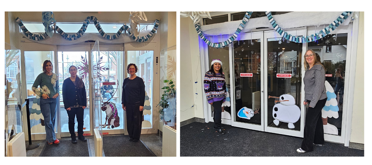 Main Library decorated both entrances with a Frozen theme, and Fairfield Woods decorated their entrance with the 60th anniversary of Peanuts.