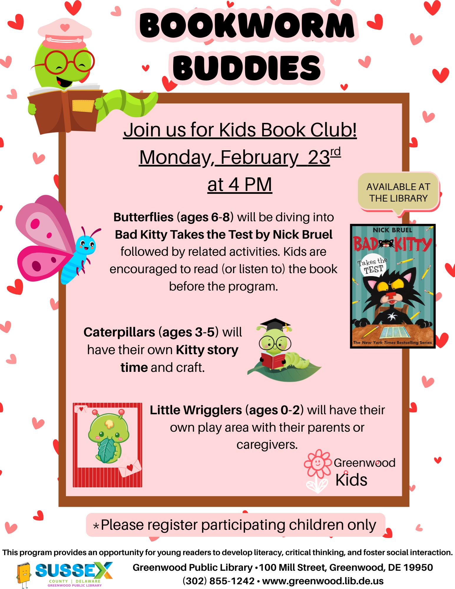 Monday, February 23rd at 4pm Get together to read, talk about books, and do fun activities that go along with the books at Bookworm Buddies on Monday, February 23rd from 4:00-5:00pm. Our monthly Bookworm Buddies is split up into different ages into groups. Please register all participating children. For further questions, please call the library at (302) 855-1242. Butterflies (ages 6-8) will be diving into Bad Kitty Takes the Test by Nick Bruel, followed by related activities. Kids are encouraged to read (or listen to) the book before the program. Copies of the book will be available at the Greenwood Public Library, and e-books and e-audiobooks are also available on Libby. Caterpillars (ages 3-5) will have their own kitty story time and craft followed by play time. Little Wrigglers (ages 0-2) will have their own play area with their parents or caregivers. This program provides an opportunity for young readers to develop literacy, critical thinking, and foster social interaction.
