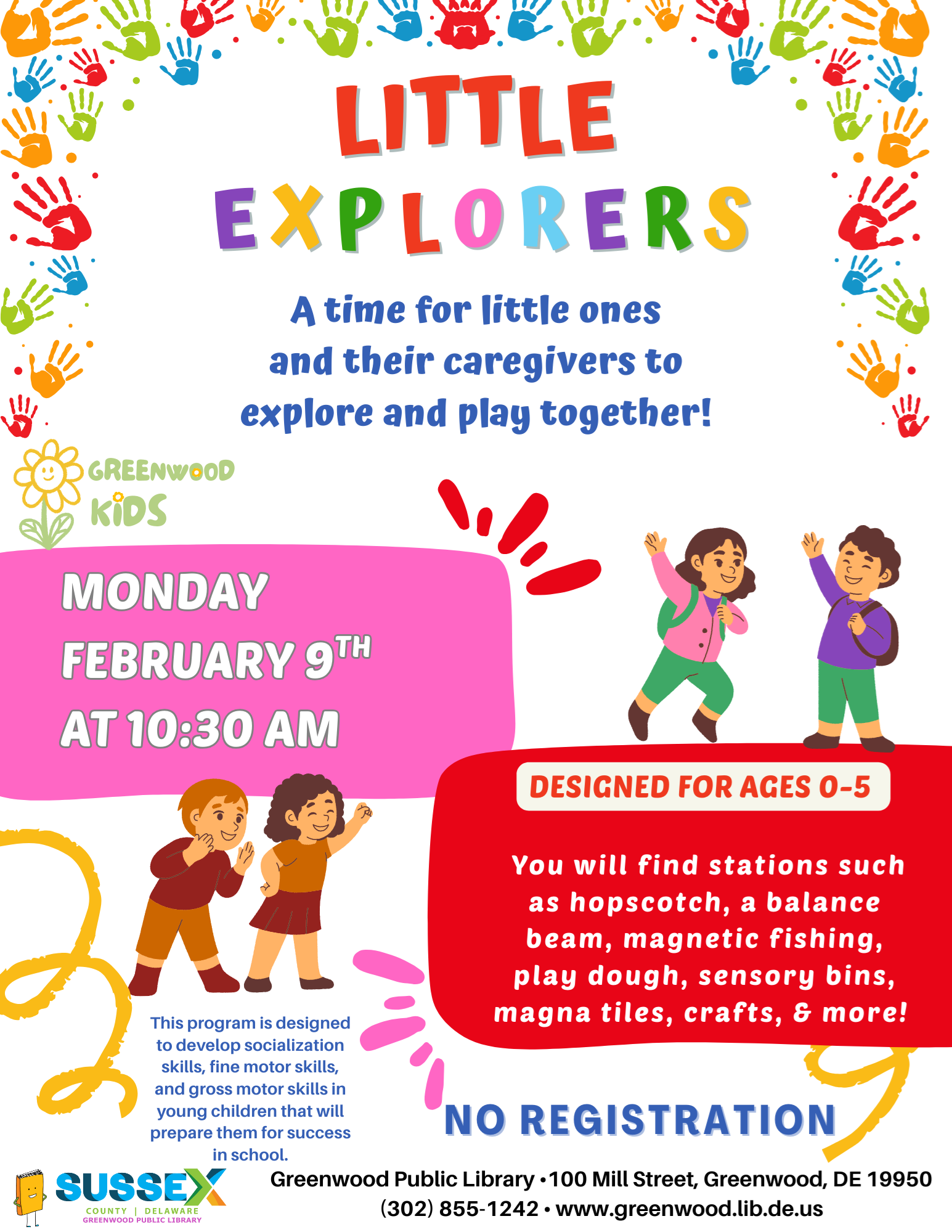 Little Explorers Monday, February 9th at 10:30am Explore and play with us at the Greenwood Public Library Monday, February 9th from 10:30am to 12:00pm! Children ages 2-5 and their caregivers can stop by and try out a variety of fun activities together. There will be activity stations like hopscotch, a balance beam, magnetic fishing, play dough, sensory bins, and magna tiles for all to enjoy. For further questions, please call the library at (302) 855-1242. This program is designed to develop socialization skills, fine motor skills, and gross motor skills in young children that will prepare them for success in school.
