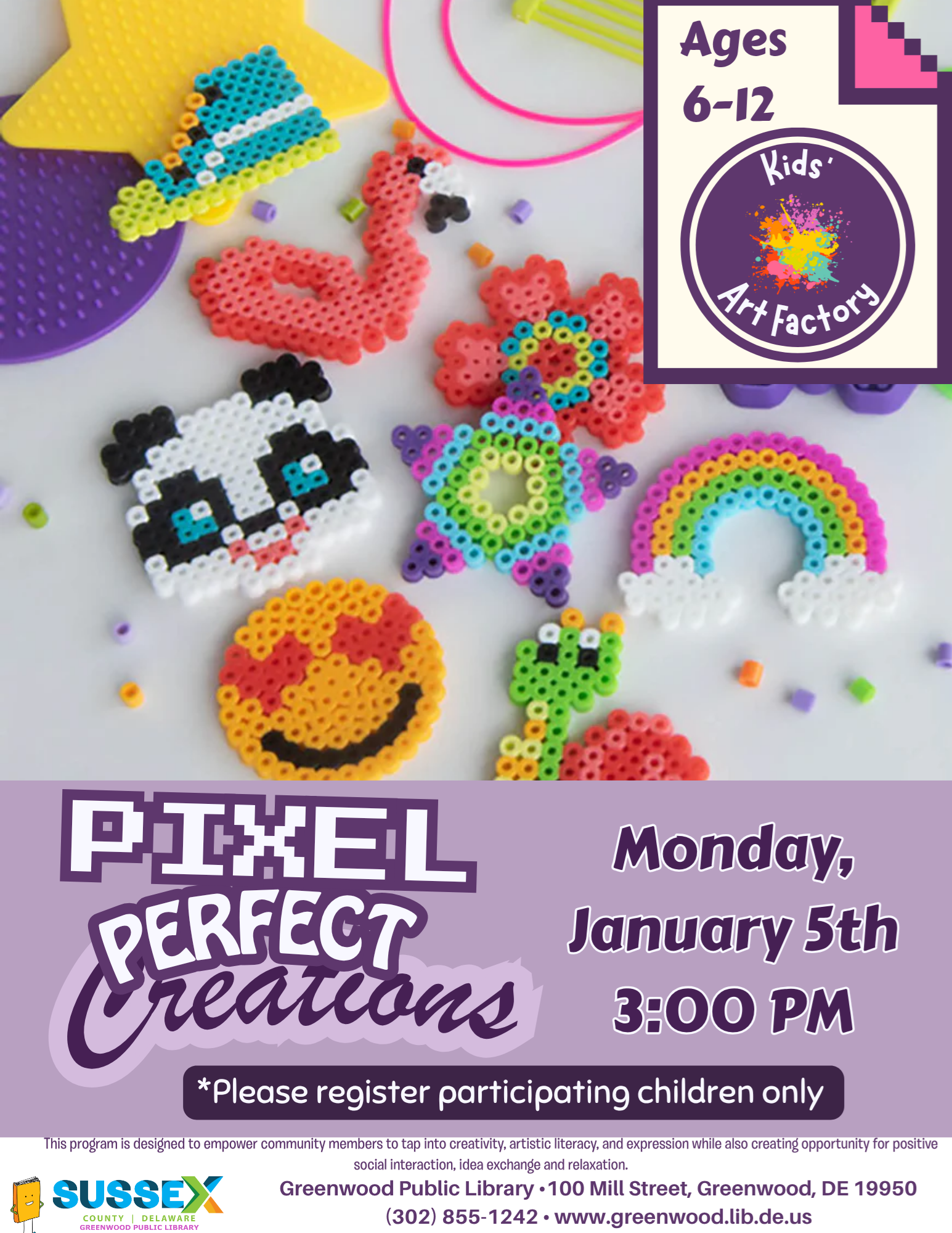 Monday, January 5th at 3pm Join us at the Greenwood Public Library on Monday, January 5th from 3:00-5:00pm for fun at the Kids Art Factory. This month in Pixel Perfect Creations, we will be making Perler bead designs. Please note that the completed projects may need to be picked up on January 7th to allow for ironing time. This class is designed for ages 6-12. Please register all participating children. For further questions, please call the library at (302) 855-1242. This program is designed to empower community members to tap into creativity, artistic literacy, and expression while also creating opportunity for positive social interaction, idea exchange and relaxation.