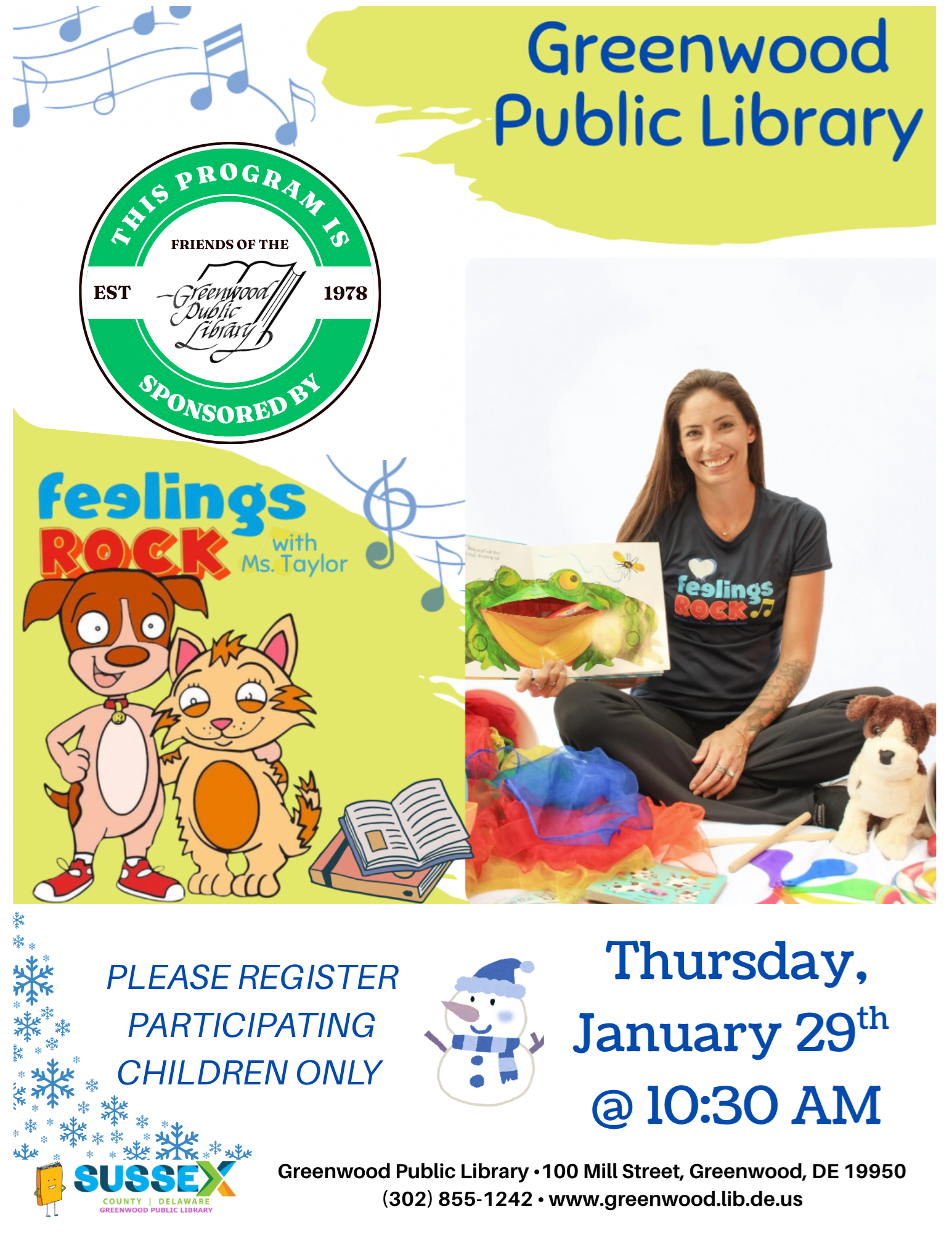 Thursday, January 29th at 10:30am Feelings Rock is a music and movement-based class that is designed to help children ages NB-5 and their families navigate social emotional development. Get ready to learn how to recognize, express and cope with emotions, engage in fun learning activities and promote a healthy body with movement! We like to have fun with the use of sign language, rhythm sticks, shaker eggs, puppets, stories, instruments and so much more! Classes are 30 minutes long and designed to keep the children fully engaged! 30 minutes of free play will follow the program. Please register each participating child aged newborn to 5 years old. Adults need not register. For further questions, please call the library at (302) 855-1242. This program provides an opportunity for young children to learn important social, emotional, and intellectual skills that will prepare them for success in school.