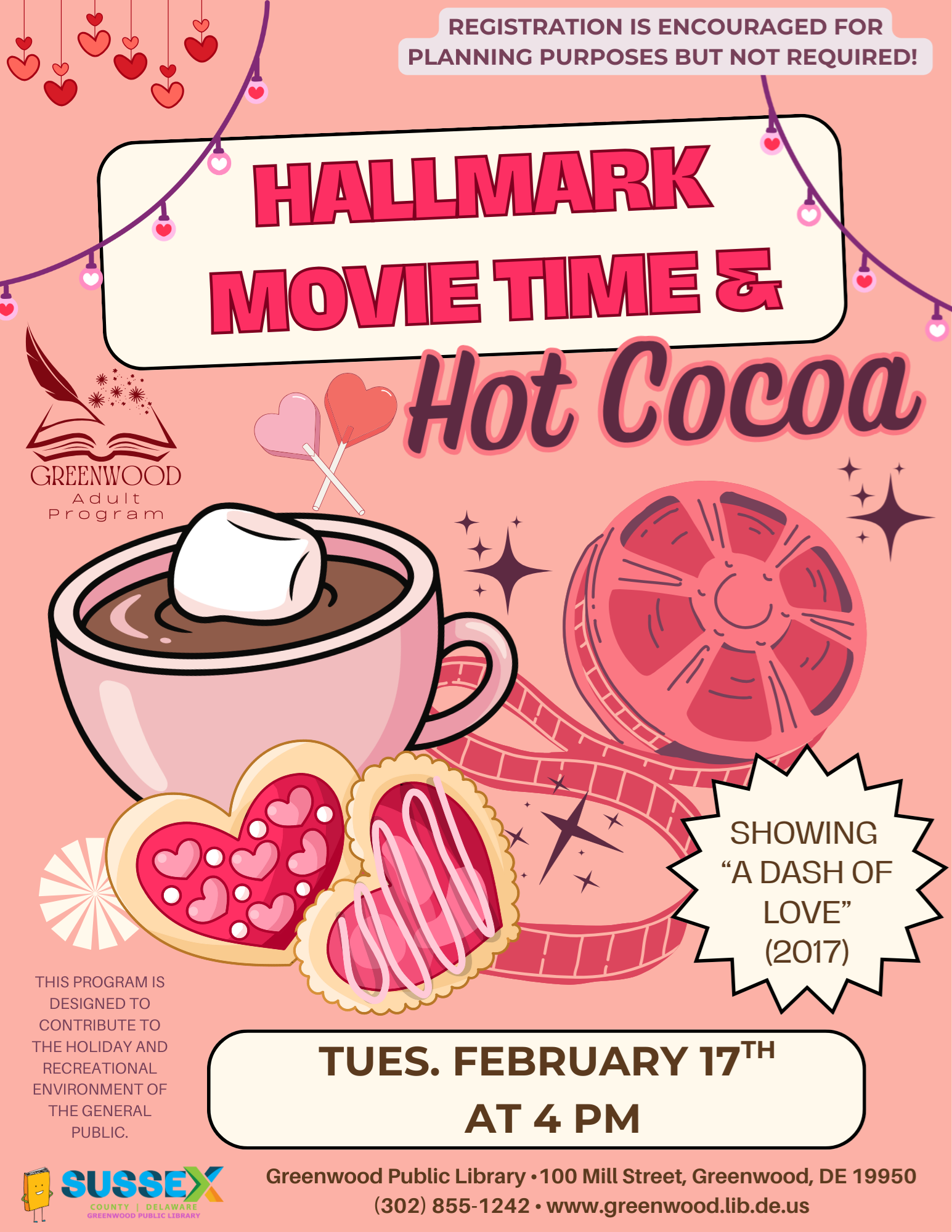 Tuesday, February 17th at 4pm Come to the Greenwood Library on Tuesday, February 17 @ 4pm for a showing of the Hallmark movie, "Dash of Love". Bring a friend if you like, relax and enjoy a hot cup of cocoa or tea and cookies in honor of Valentine's Day. Registration is preferred for planning purposes, but don't let that keep you from joining us! For more information call us at 302-855-1242. This program is designed to contribute to the holiday and recreational environment of the general public.