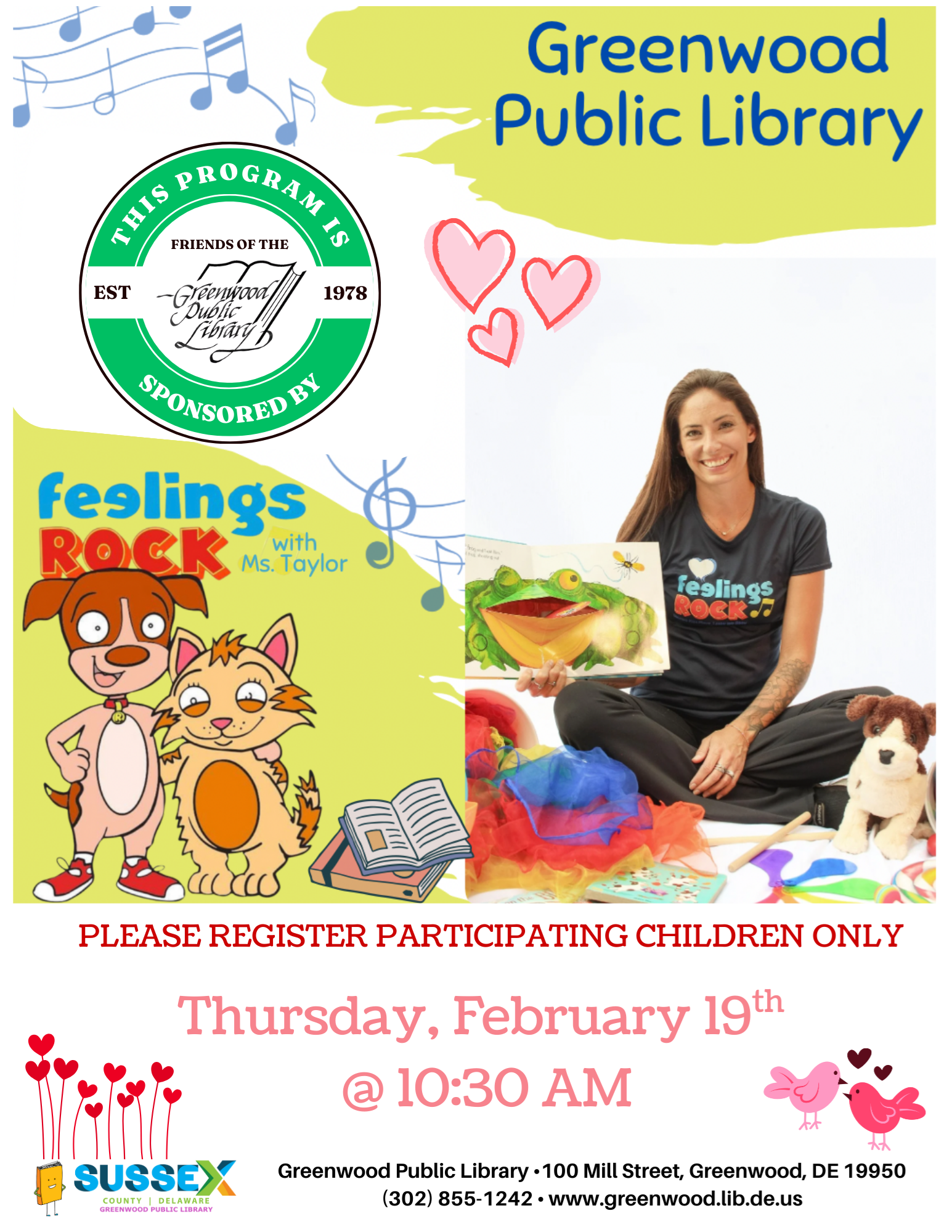 Thursday, February 19th at 10:30am Feelings Rock is a music and movement-based class that is designed to help children ages NB-5 and their families navigate social emotional development. Get ready to learn how to recognize, express and cope with emotions, engage in fun learning activities and promote a healthy body with movement! We like to have fun with the use of sign language, rhythm sticks, shaker eggs, puppets, stories, instruments and so much more! Classes are 30 minutes long and designed to keep the children fully engaged! 30 minutes of free play will follow the program. Please register each participating child aged newborn to 5 years old. Adults need not register. For further questions, please call the library at (302) 855-1242. This program provides an opportunity for young children to learn important social, emotional, and intellectual skills that will prepare them for success in school.