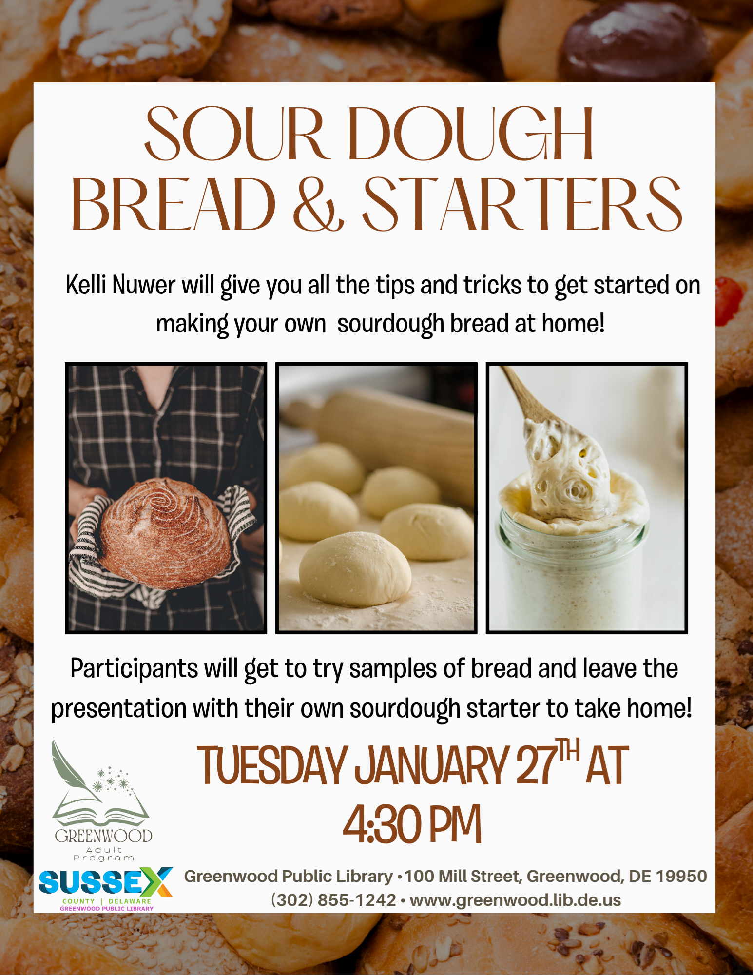 Sourdough Bread and Starters Tuesday, January 27th at 4:30pm The Greenwood Public Library will be hosting a sourdough bread and starters on Tuesday, January 27 @ 4:30pm with Kelli Nuwer. Learn what is involved with making your own sourdough bread and leave with your own starter to get you going on your own personal bread baking journey! Samples available for tasting. For more information, call us at 302-855-1242. This program is designed to teach patrons valuable cooking skills in a fun and upbeat environment while covering topics such as nutrition, food prep, kitchen safety, cultural foods and budgeting.