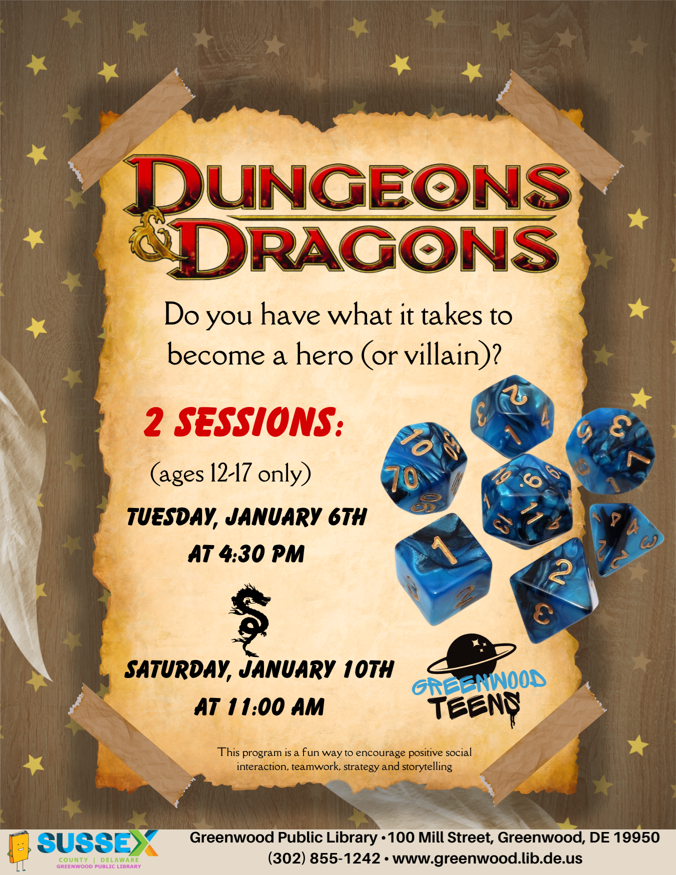 Dungeons & Dragons - Teens Tuesday, January 6th at 4:30pm and Saturday, January 10th at 11am Do you have what it takes to become a hero (or villain)? Teens will have two chances to Find out at the Greenwood Public Library in January. Dungeons and Dragons Teen Sessions are happening Tuesday, January 6th at 4:30pm and Saturday, January 10th at 11am! Our resident Dungeon Master will guide players through a world of storytelling, adventure, combat, and imagination in this classic table top RPG. Ages 12-17, space is limited first come first served. Call 302-855-1242 for more info. This program is a fun way to encourage positive social interaction, teamwork, strategy and storytelling.