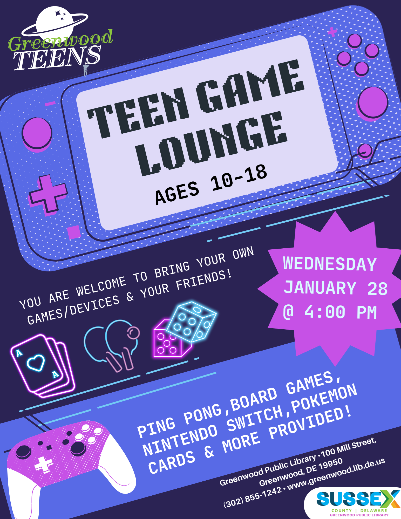 Teen Game Lounge Wednesday, January 28th at 4pm On Wednesday, January 28th at 4pm Teens and tweens can come to the Greenwood Public Library to hang out and play all kinds of games! A Nintendo Switch will be available with several game options but please feel encouraged to bring your own games and controllers as well! Board games and a ping pong table will also be available. TCG's such as Magic: The Gathering, Yugioh, and Pokemon are encouraged as well. Inappropriate language and behavior will not be tolerated. Ages 10+. For more information go to greenwood.lib.de.us or call 302-855-1242. This program is a fun way to encourage positive social interaction, teamwork, strategy and healthy competition.