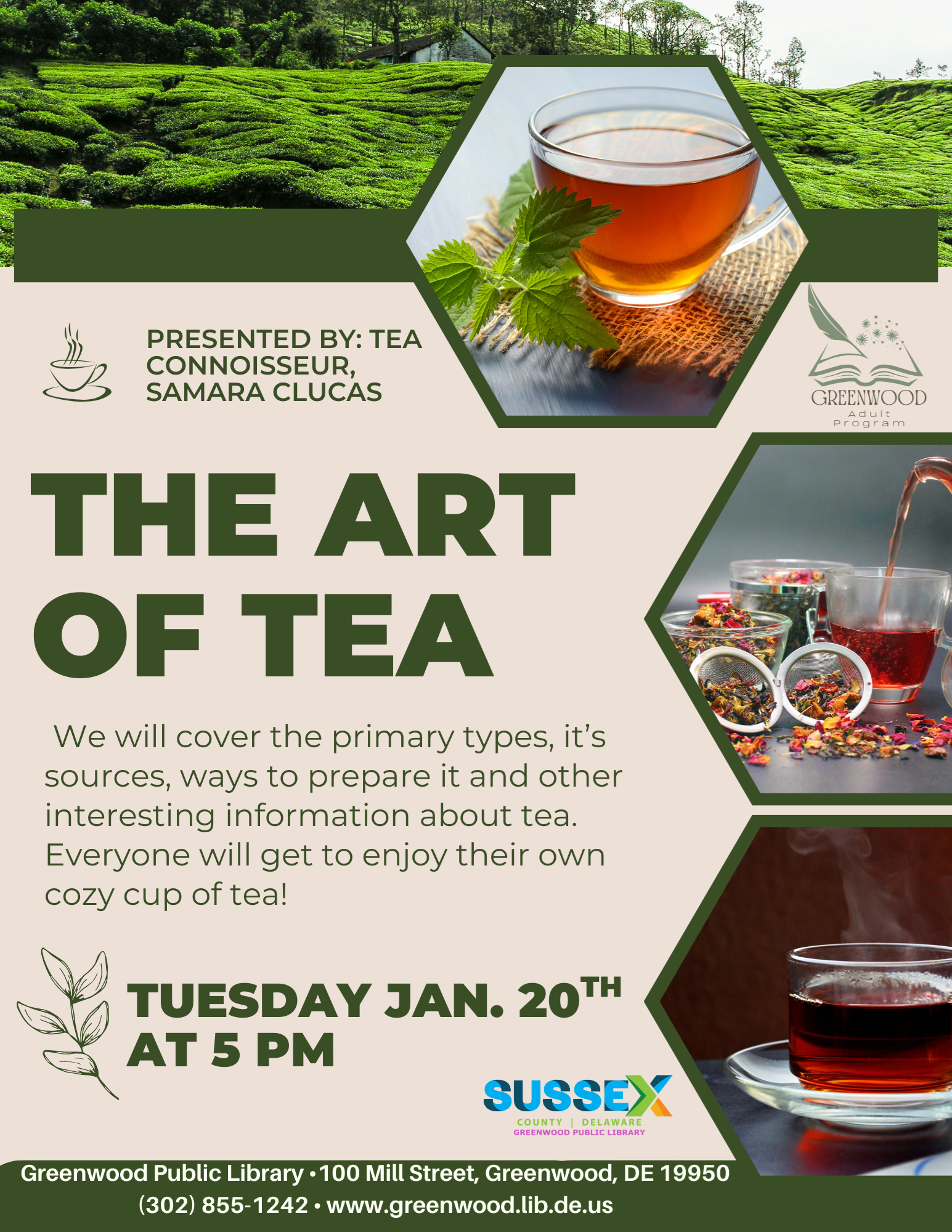 The Art of Tea Tuesday, January 20th at 5pm Come to the Greenwood Public Library on Tuesday, January 20 at 5pm for a cozy presentation about tea by tea connoisseur, Samara Clucas. Samara will cover the primary types of tea, their sources, ways to prepare it and other interesting information about tea. We will end with a cozy cup of tea. For more information call us at 302-855-1242. This program is designed to widen our knowledge and appreciation of the culinary arts in a fun and upbeat environment.