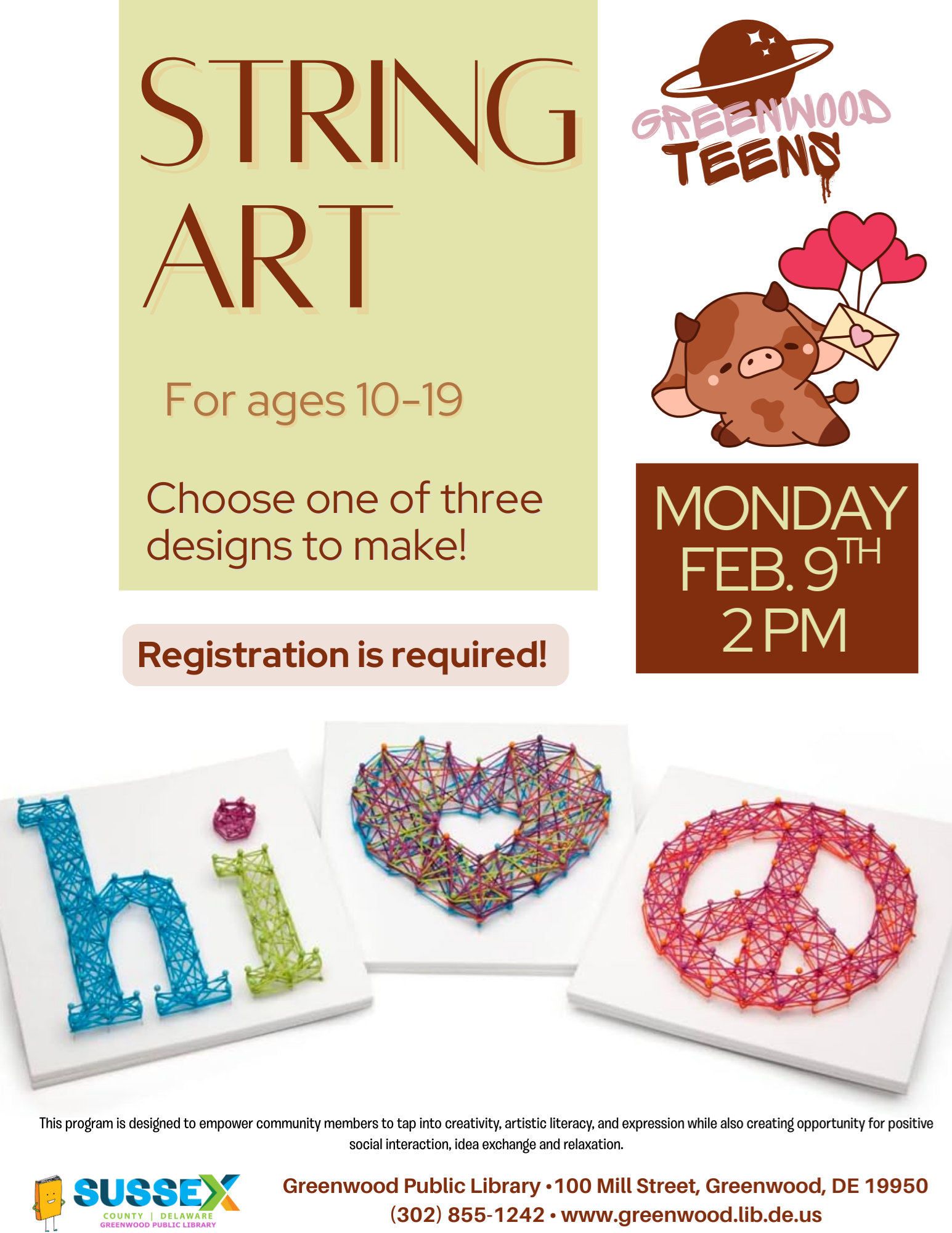 Monday, February 9th at 2pm Teens can come to the Greenwood Public Library on Monday, February 9th at 2pm to make string art! Choose between 3 Different String Art Designs. For creative Teens and tweens 10-19 years old. Registration is required and space is limited. For more info or to register call (302) 855-1242. This program is designed to empower community members to tap into creativity, artistic literacy, and expression while also creating opportunity for positive social interaction, idea exchange and relaxation.