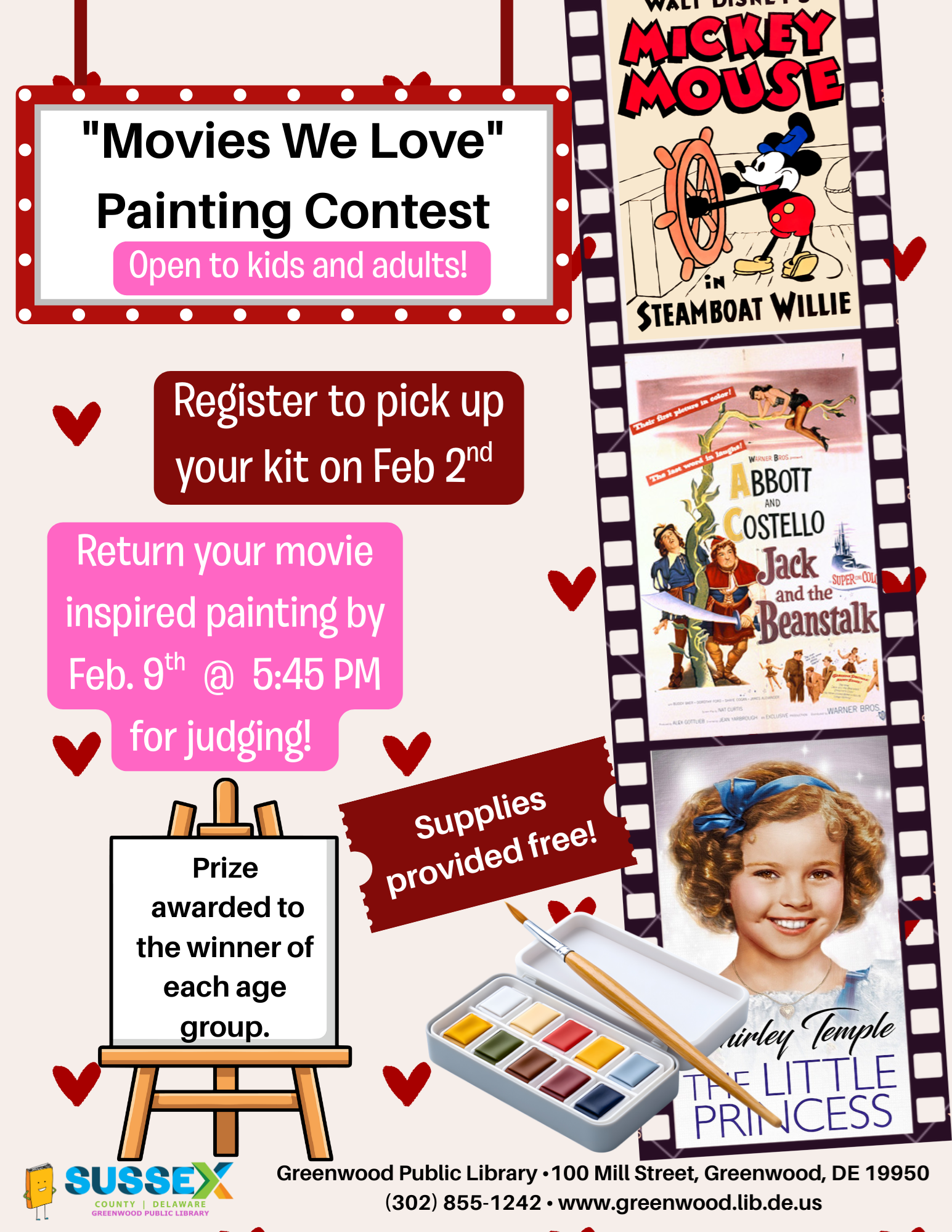 Begins Monday, February 2nd at 10am Due Monday, February 9th at 6:45pm Paint a movie that you love! Register to reserve and pick up your kit including paint, paint brush, and canvas at the Greenwood Public Library on Monday, February 2nd. You may also use any additional supplies you have at home to create your masterpiece. Kits that are not picked up on February 2nd will be given out to those on the wait list or first come, first served the next day. Please Return your completed painting by Monday, February 9th at 5:45 PM to enter into our painting display and contest. Entries will be placed in the following age groups: 4-6, 7-9, 10-12, 13-15, 16-18 and adults 19+. Prizes will be awarded to a winners in each age group!! Paintings will be displayed in the library until Monday, February 23rd when they can be picked up to take home, along with prizes. The Greenwood Public Library reserves the right not to display entries deemed inappropriate for the general public. For further questions, please call the library at (302) 855-1242. This program is designed to enhance creativity and expression, while also creating opportunities for positive social interaction and relaxation.