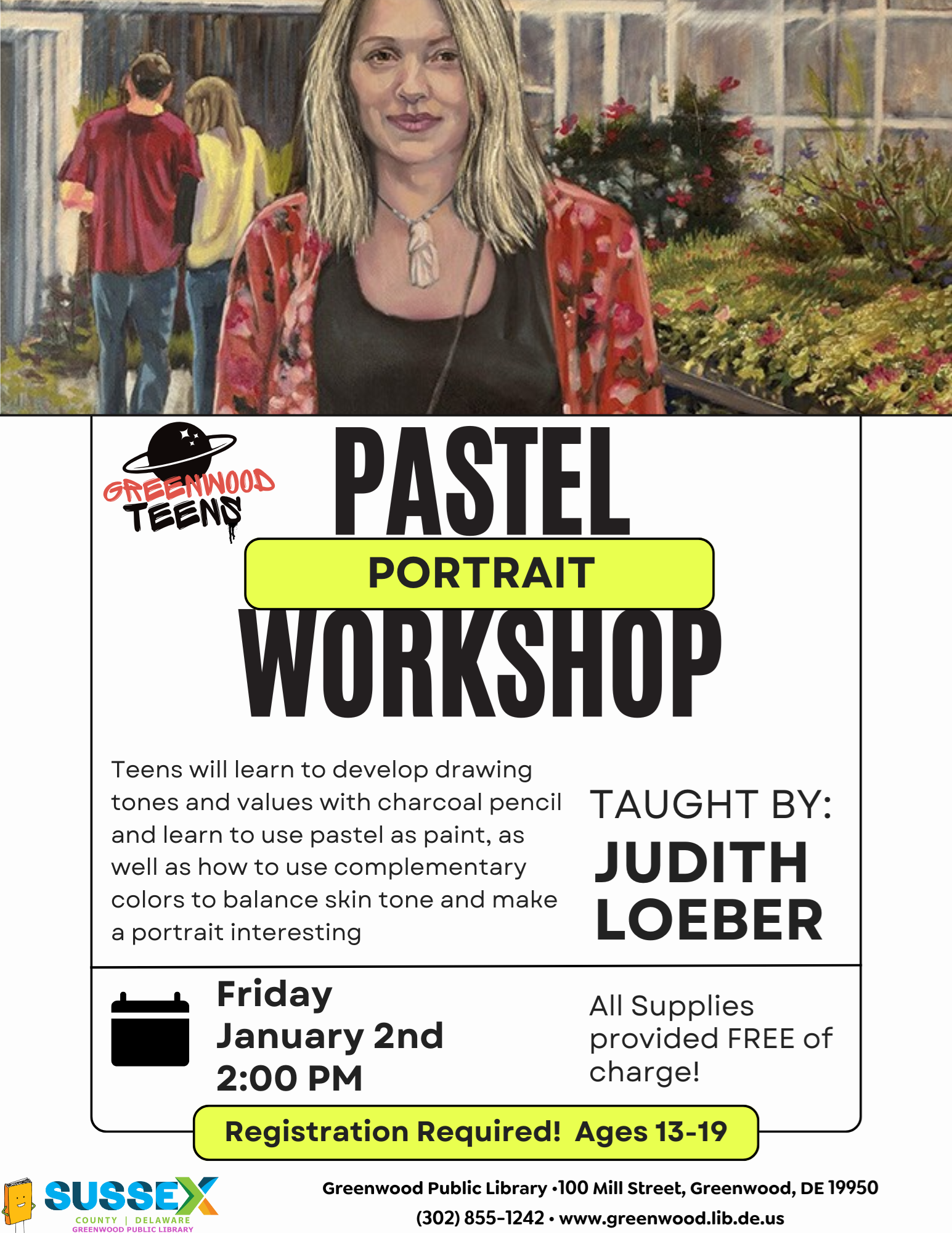 Friday, January 2nd at 2pm Join Judith Loeber for Pastel Painting with Portraiture, at the Greenwood Public Library on Friday, January 2nd at 2pm. Teens will learn to develop drawing tones and values with charcoal pencil and learn to use pastel as paint, as well as how to use complementary colors to balance local color skin tone, and make a portrait interesting. Students will also learn how to create color washes, and overlay color. Charcoal, Pastels and paper will be provided. For creative Teens up to 19 years old. Registration is required and space is limited. For more info or to register call (302) 855-1242. This program is designed to empower community members to tap into creativity, artistic literacy, and expression while also creating opportunity for positive social interaction, idea exchange and relaxation.