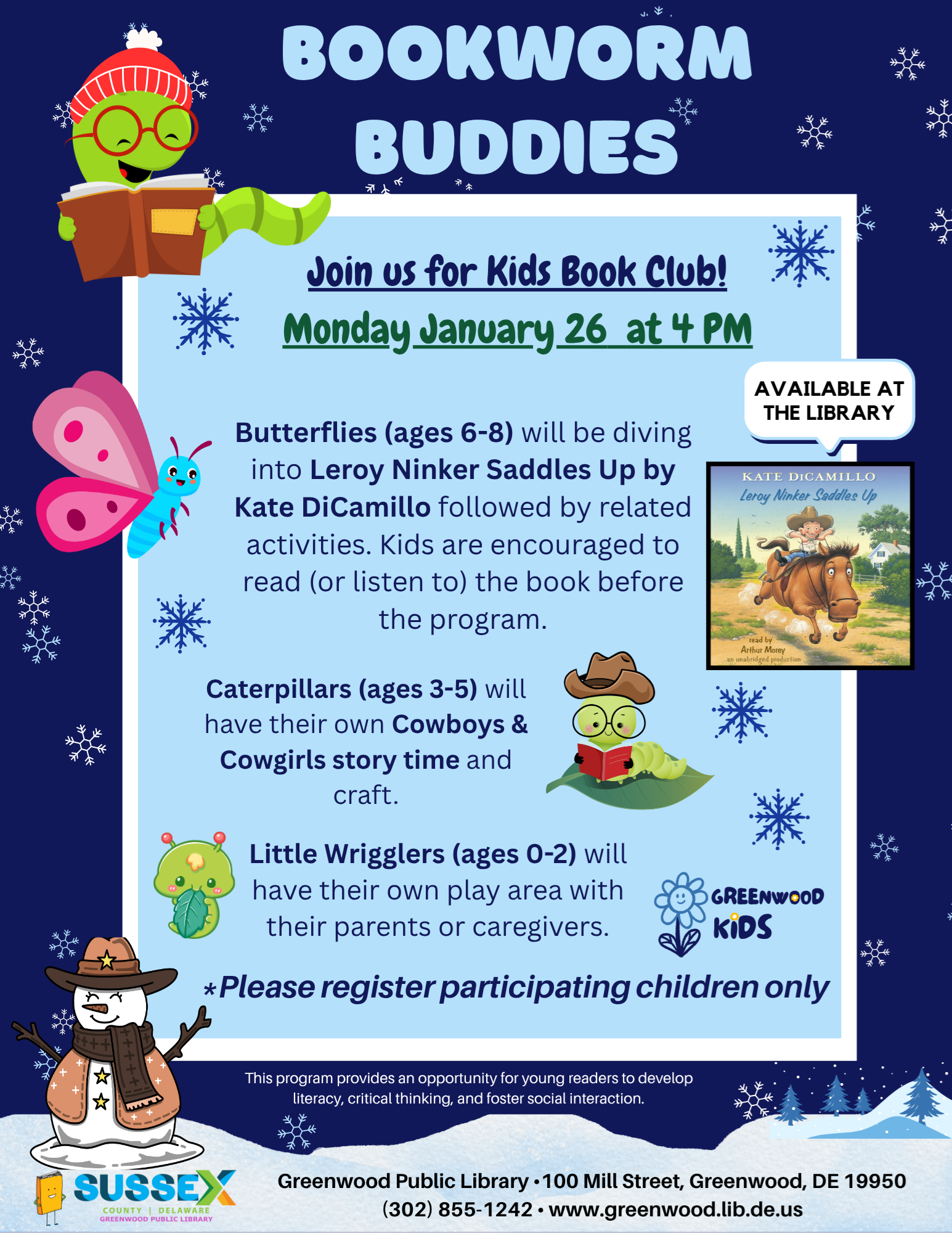 Monday, January 26th at 4pm Get together to read, talk about books, and do fun activities that go along with the books at Bookworm Buddies on Monday, January 26th from 4:00-5:00pm. Our monthly Bookworm Buddies is split up into different ages into groups. Please register all participating children. For further questions, please call the library at (302) 855-1242. Butterflies (ages 6-8) will be diving into Leroy Ninker Saddles Up by Kate DiCamillo, followed by related activities. Kids are encouraged to read (or listen to) the book before the program. Copies of the book will be available at the Greenwood Public Library, and e-books and e-audiobooks are also available on Libby. Caterpillars (ages 3-5) will have their own cowboys & cowgirls story time and craft followed by play time. Little Wrigglers (ages 0-2) will have their own play area with their parents or caregivers. This program provides an opportunity for young readers to develop literacy, critical thinking, and foster social interaction.