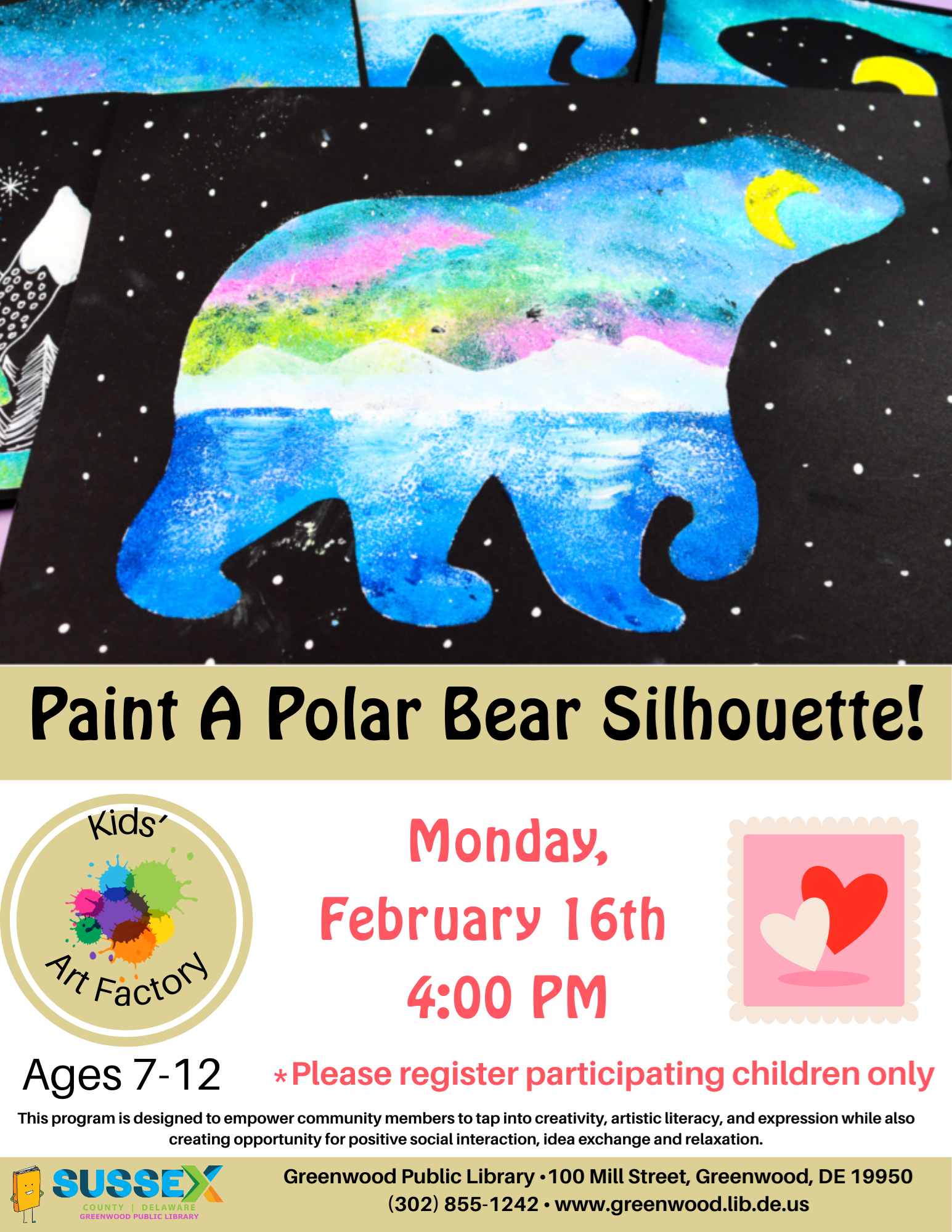 Monday February 16th at 4pm Join us at the Greenwood Public Library on Monday, February 16th from 4:00-5:30pm for some arctic fun at the Kids Art Factory. This month, we will be making polar bear silhouette paintings. This class is designed for children ages 7-12. Please register all participating children. For further questions, please call the library at (302) 855-1242. This program is designed to empower community members to tap into creativity, artistic literacy, and expression while also creating opportunity for positive social interaction, idea exchange and relaxation.