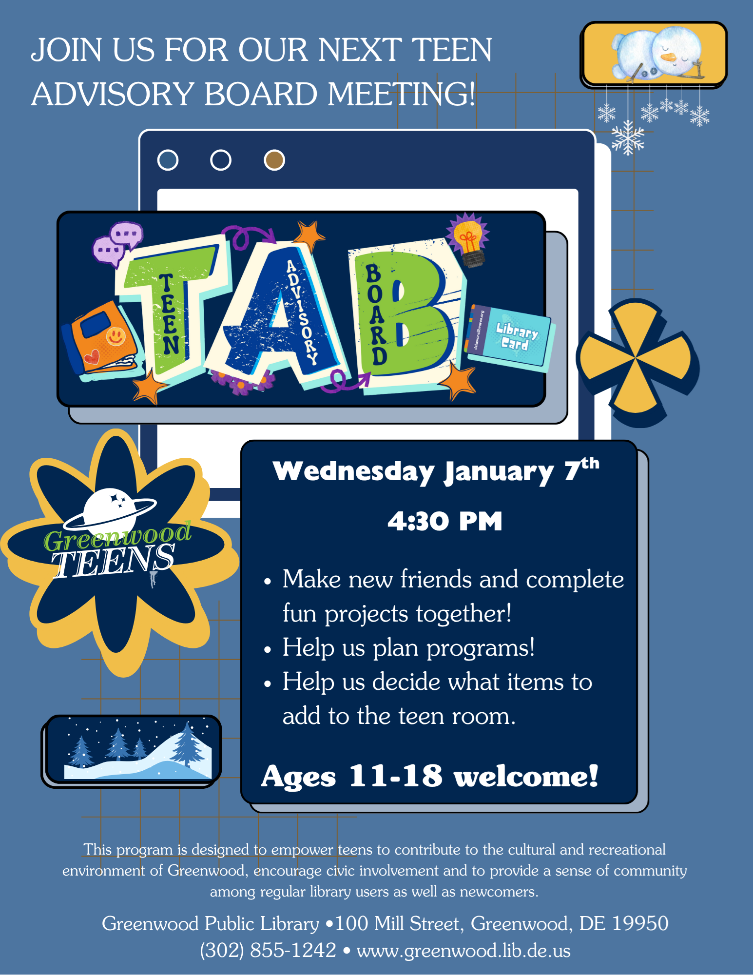 Teen Advisory Board Wednesday, January 7th at 4:30pm The monthly meeting of the Greenwood Public Library's Teen Advisory Board is on Wednesday January 7th at 4:30pm. Teens can come together at the Greenwood Public Library to collaborate, brainstorm, and share ideas while receiving the library’s support to bring your visions to life. Here, you have the opportunity to express your thoughts, plan innovative programs and displays, decide which materials should be available for teens, and connect with new friends. This program is designed to empower teens to contribute to the cultural and recreational environment of Greenwood, encourage civic involvement and to provide a sense of community among regular library users as well as newcomers. Ages 11+ For more info call 302-855-1242.