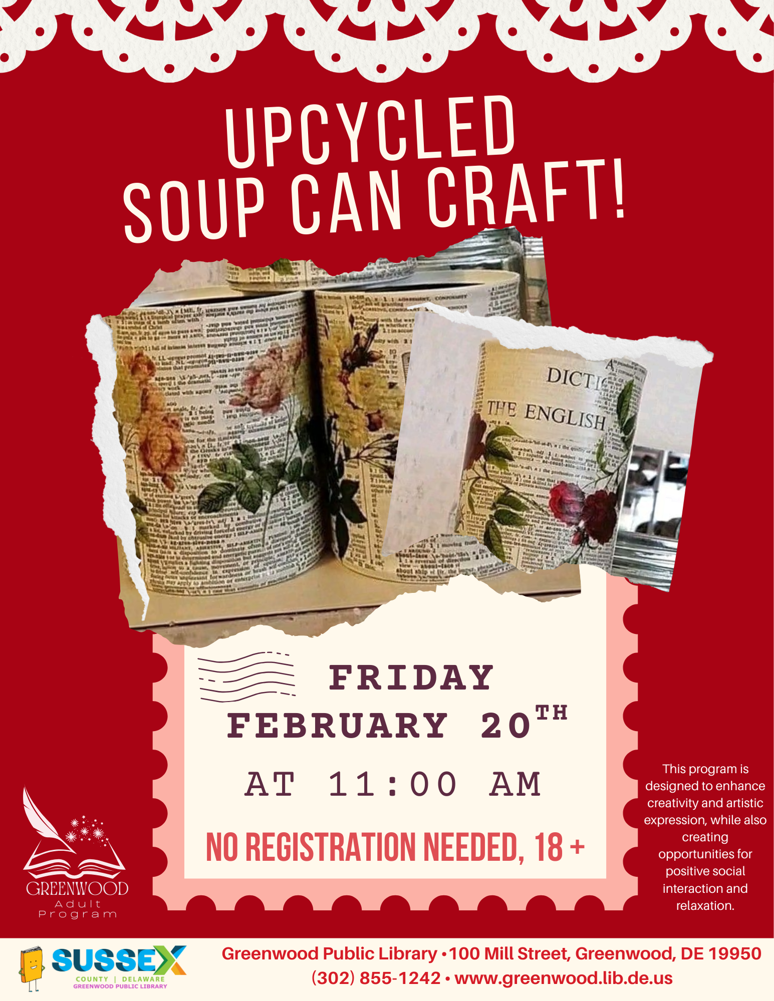 Upcycled Soup Can Friday, February 20th at 11am Join us on Friday, February 20 @ 11am and make your own vintage can using old book pages and embellishments. Supplies are provided. Adults 18+. Seating is limited. First come first served. For more information, call us at 302-855-1242. This program is designed to enhance creativity and artistic expression, while also creating opportunities for positive social interaction and relaxation.