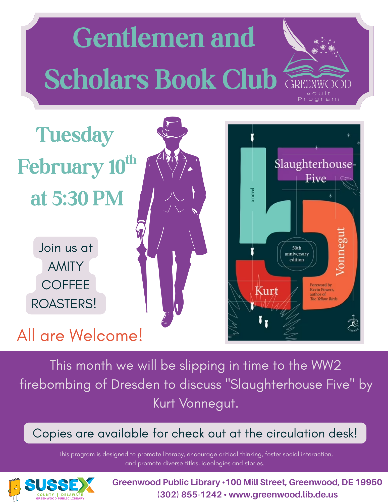 Gentlemen and Scholars Book Club: Slaughterhouse Five Tuesday, February Join the Gentlemen and Scholars Book Club at Amity Coffee Roasters on Tuesday, February 10th at 5:30pm. This is a club for Gentlemen & Scholars ages 18+ to discuss books and the ideas within them. This month we will be slipping in time to the WW2 firebombing of Dresden to discuss "Slaughterhouse Five" by Kurt Vonnegut. Copies will be available at the library. For more info call 302-855-1242. This program is designed to promote literacy, encourage critical thinking, and foster social interaction.