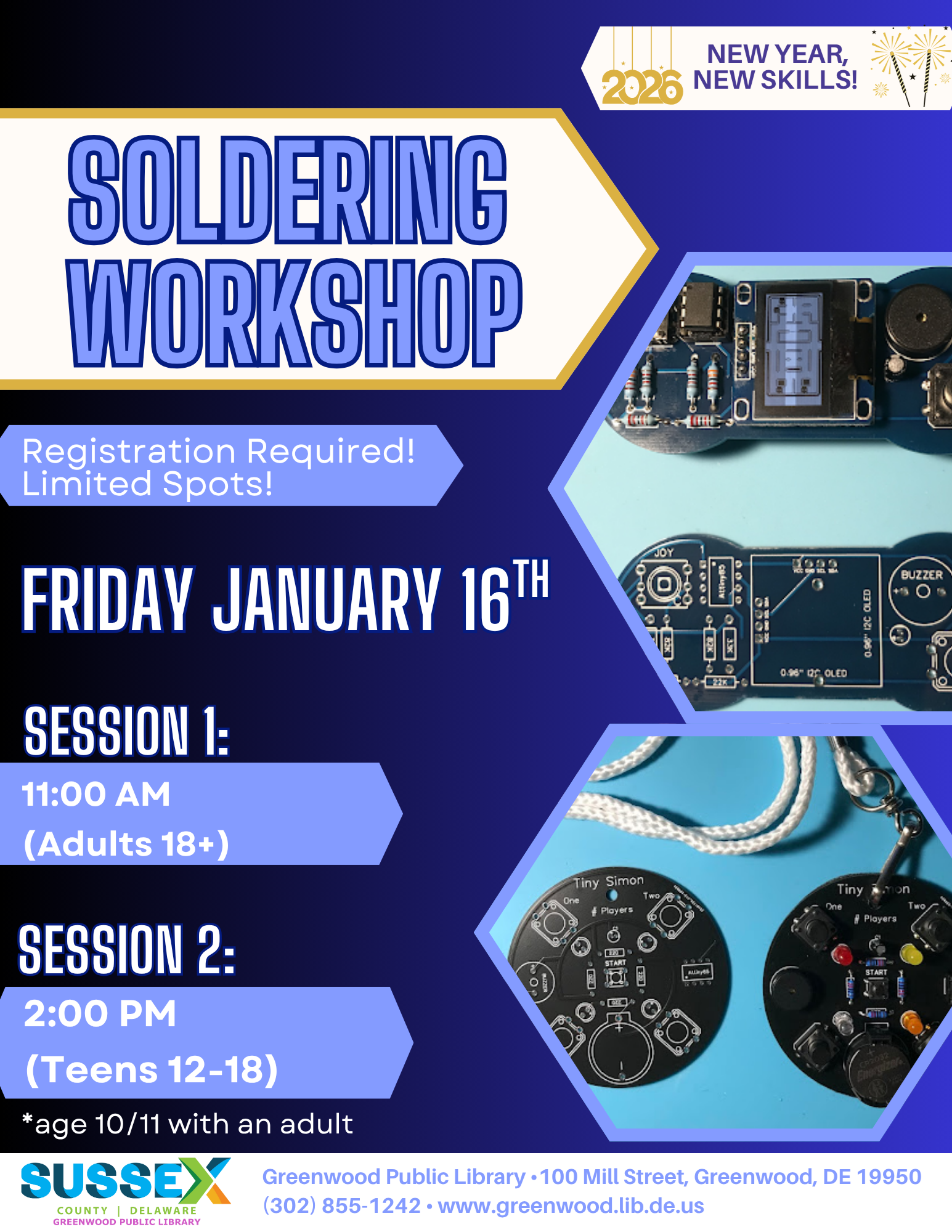 Learn to Solder Workshop Friday, January 16th Adult Session at 11am Teen Session at 2pm Come to the Greenwood Public Library on Friday, January 16th for a Learn To Solder Workshop! Participants will complete a circuit board soldering project to take home. Adult workshop at 11am is open to ages 18 and up. Teen workshop at 2pm is open to ages 10-17 (under 12 must be helped by adult) Limit six participants per session and registration is required. To register call 302-855-1242. This program is designed to give learners an understanding of the world around us, teach critical thinking skills, and develop curiosity, innovation and resourcefulness.