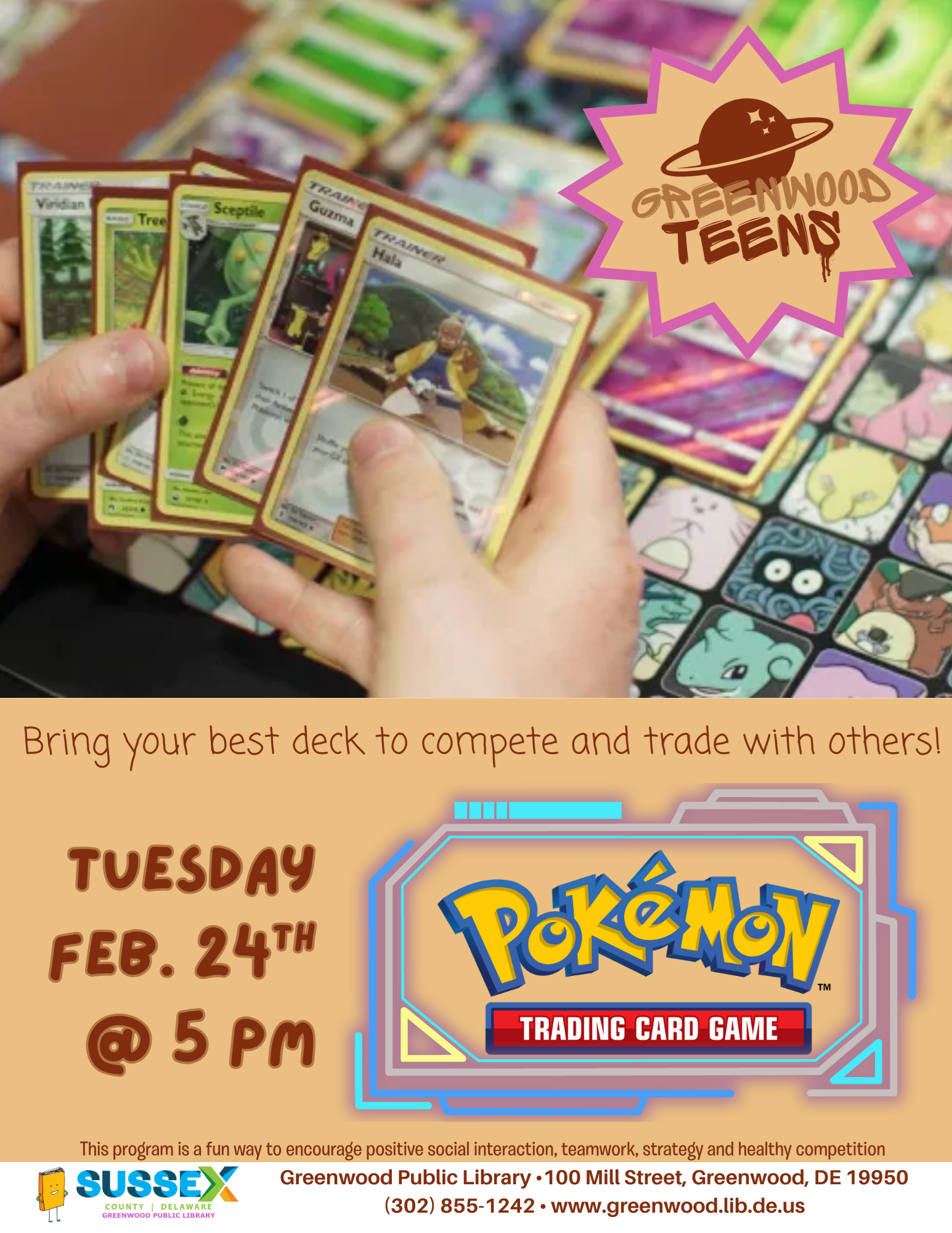 Pokemon Trading Card Game Tuesday, February 24th at 5pm Bring your best deck to the Greenwood Public Library on Tuesday, February 24th at 5pm to compete and trade with others in the Pokemon Trading Card Game! Inappropriate language and behavior will not be tolerated. Ages 10-17. For more information call 302-855-1242. No registration required. This program is a fun way to encourage positive social interaction, teamwork, strategy and healthy competition