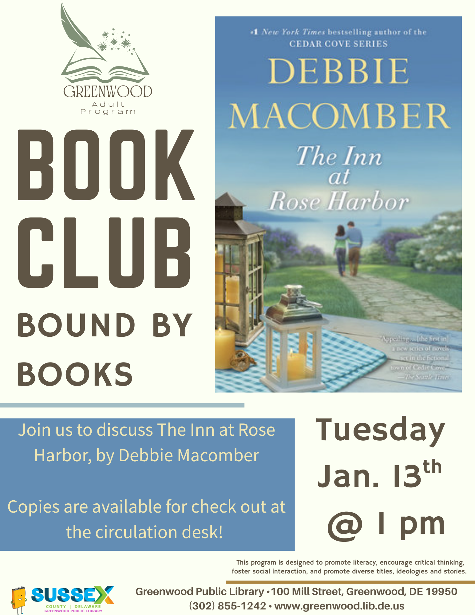 Bound By Books - The Inn at Rose Harbor Tuesday, January 13th at 1pm Participants come together once a month to discuss various types of books at the Greenwood Public Library. The book to be discussed on Tuesday, January 13 @ 1pm will be, The Inn at Rose Harbor, by Debbie Macomber. Pick up your copy at Greenwood Public Library. No registration is required. For more information call us at 302-855-1242. This program is designed to promote literacy, encourage critical thinking, foster social interaction, and promote diverse titles, ideologies and stories to the general public.