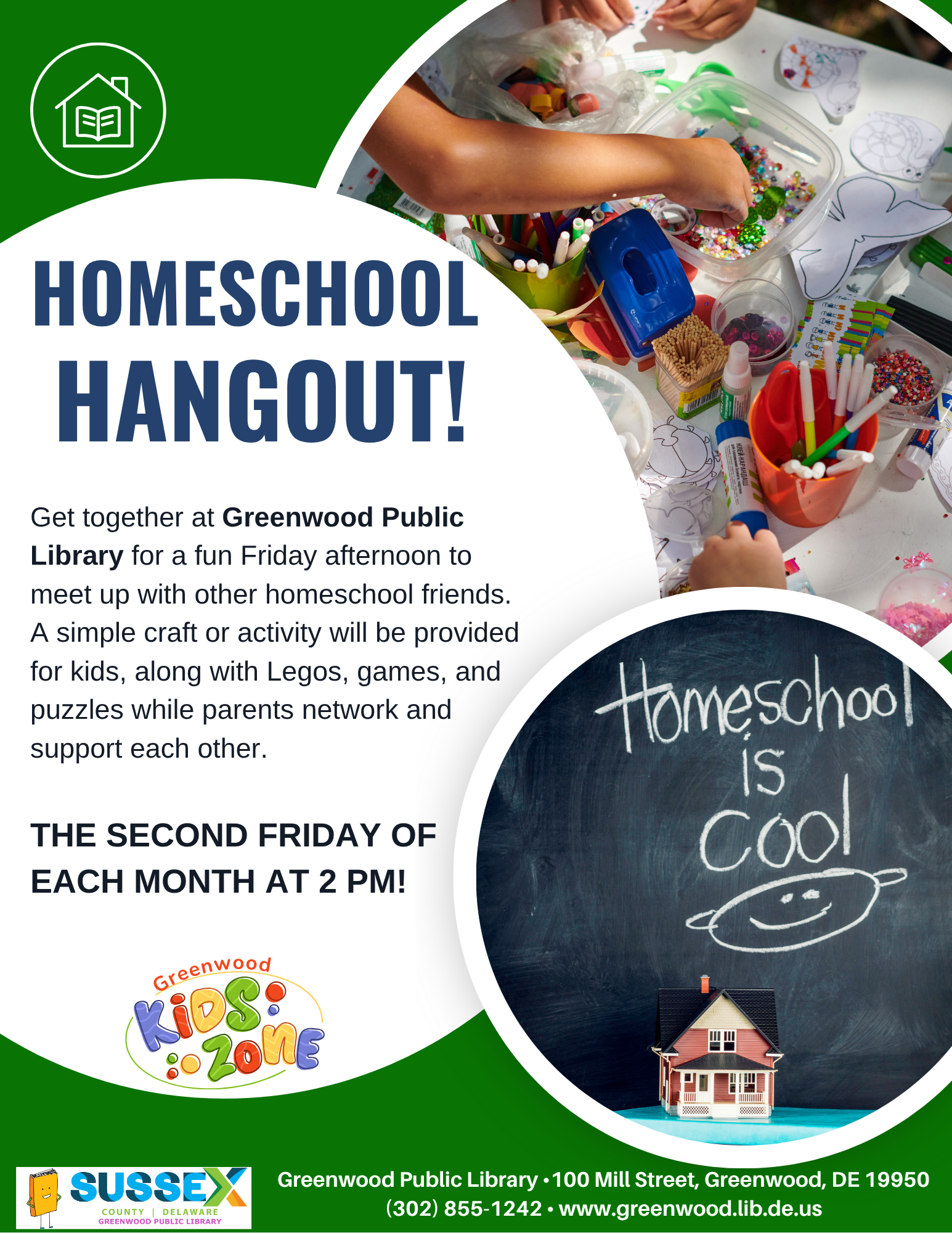 Homeschool Hangout Friday, January 9th at 2pm Get together for a fun Friday afternoon to meet up with other homeschool friends. A simple craft or activity will be provided for kids, along with Legos, games, and puzzles while parents network, support each other, and browse our free homeschool collection for materials. Meet at the Greenwood Public Library on the second Friday of each month from September to April from 2:00-3:30pm. No registration is needed. For further questions, please call (302) 855-1242. This program is designed to contribute to the cultural and recreational environment and encourage socialization.