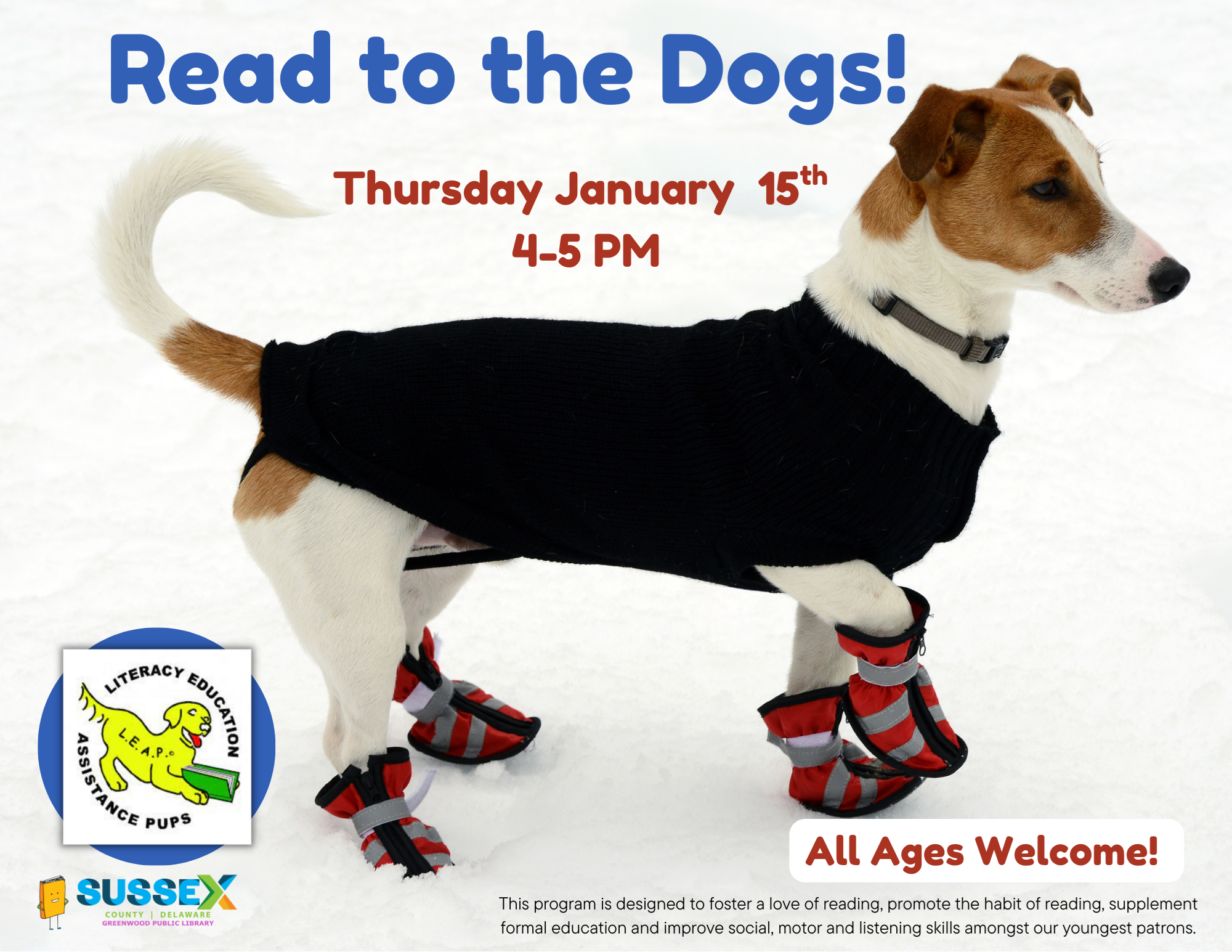Read to the Dogs Thursday, January 15th at 4pm L.E.A.P. (Literacy Education Assistance Pups) Program – Read to the Dogs - is free and open to children of all ages. Come in to practice your reading and have a tail-waggin’ good time! L.E.A.P. sessions will be held at the Greenwood Library on the first and third Thursdays of the month. No registration is required; just come to the Greenwood Library any time between 4:00 and 5:00 p.m., choose a 4-legged, tail-wagging reading partner, and enjoy a good book together. Books are provided. For more information, call us at 302-855-1242. This program is designed to foster a love of reading, promote the habit of reading, supplement formal education and improve social, motor and listening skills amongst our youngest patrons.