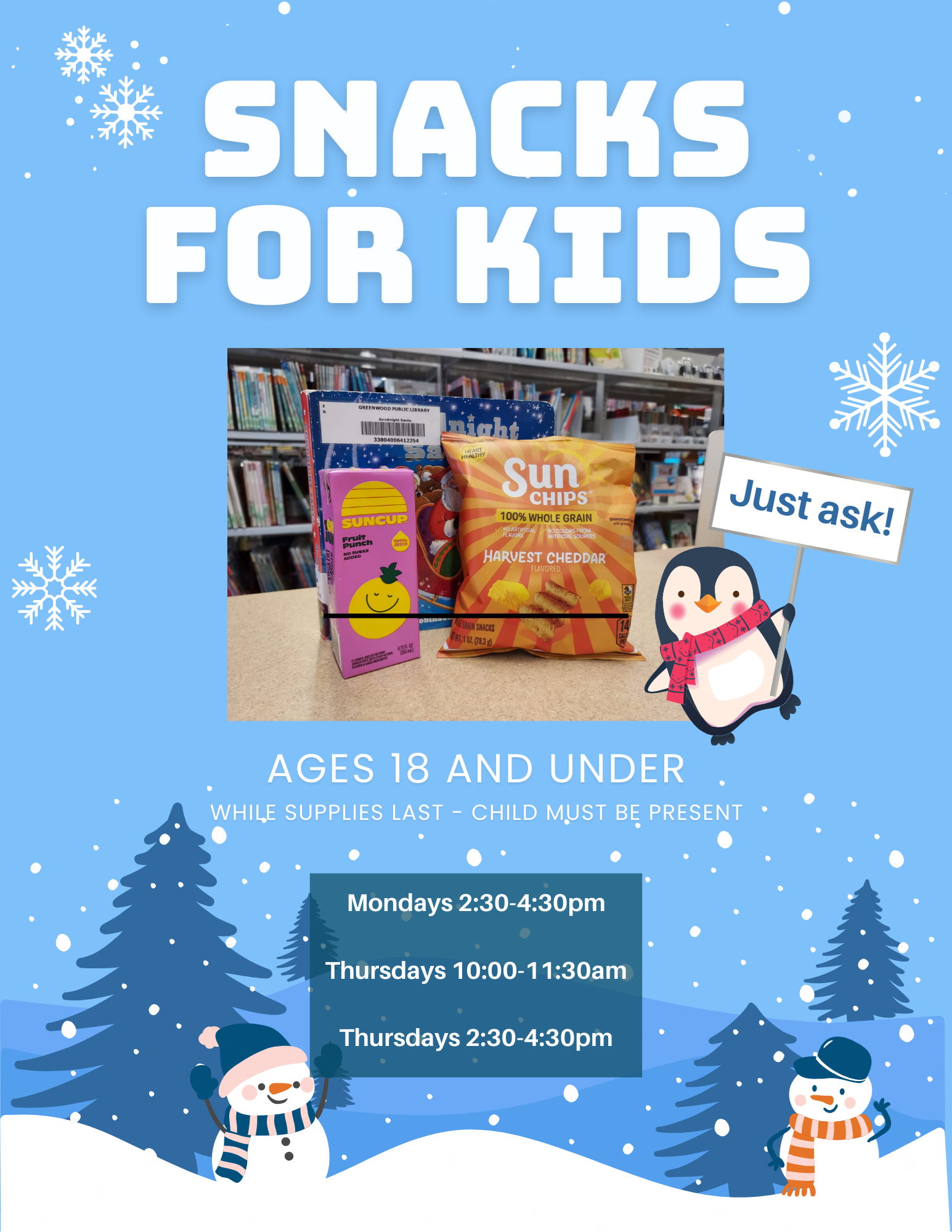 Snacks For Kids Mondays 2:30pm-4:30pm Thursdays 10am-11:30am and 2:30pm-4:30pm Free snacks are available to all kids and teens ages 18 and younger. Snacks will be provided on Mondays and Thursdays throughout the Woodbridge School District school year at the Greenwood Public Library, while supplies last. Children must be present with their parent or guardian to receive a snack. Snacks need to be eaten outside of the library. The Child and Adult Care Food Program (CACFP), is a federal program established by the USDA, which ensures that children have access to nutritious snacks. CACFP contributes to the wellness, healthy growth, and development of young children and adults in the United States.