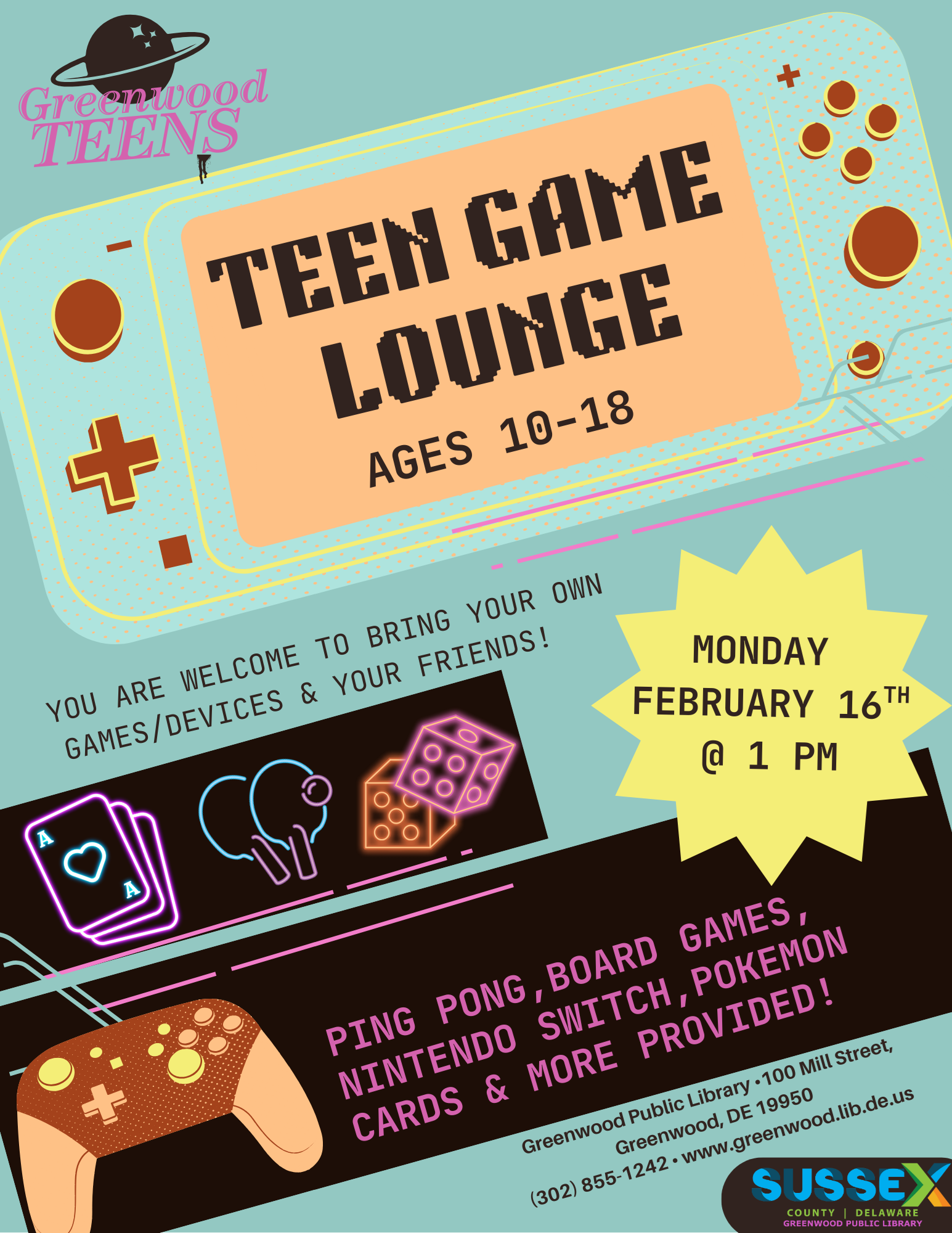 Teen Game Lounge Monday, February 16th at 1pm On Monday, February 16th at 1pm Teens and tweens can come to the Greenwood Public Library to hang out and play all kinds of games! A Nintendo Switch will be available with several game options but please feel encouraged to bring your own games and controllers as well! Board games and a ping pong table will also be available. TCG's such as Magic: The Gathering, Yugioh, and Pokemon are encouraged as well. Inappropriate language and behavior will not be tolerated. Ages 10+. For more information go to greenwood.lib.de.us or call 302-855-1242. This program is a fun way to encourage positive social interaction, teamwork, strategy and healthy competition.