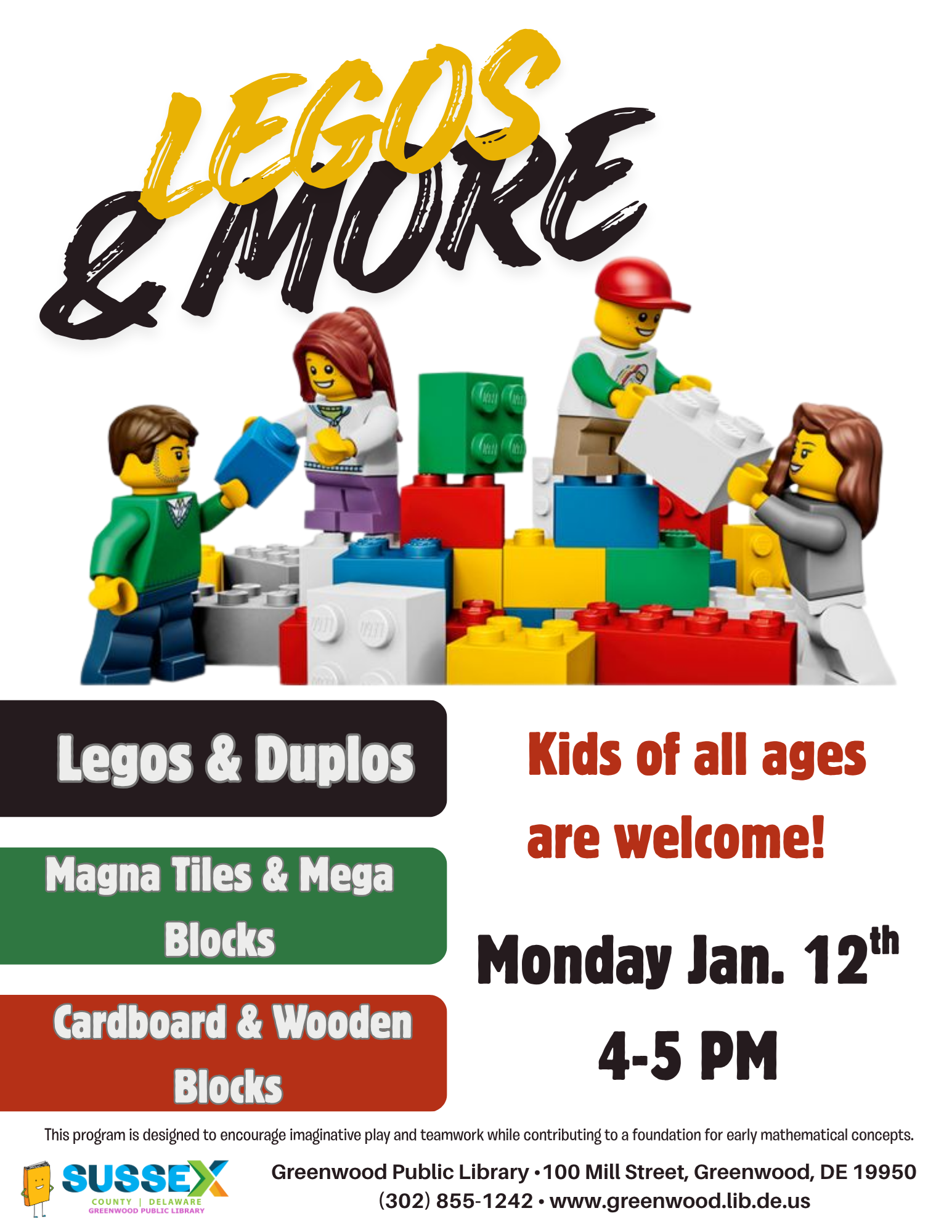 Legos & More Monday, January 12th at 4pm Kids of all ages are welcome to come and build together on Monday, January 12th from 4:00-5:00pm! Legos, Duplos, Mega Blocks, Magna Tiles, wooden blocks, and cardboard blocks will be available to choose from. For further questions, please call the library at (302) 855-1242. This program is designed to encourage imaginative play and teamwork while contributing to a foundation for early mathematical concepts.