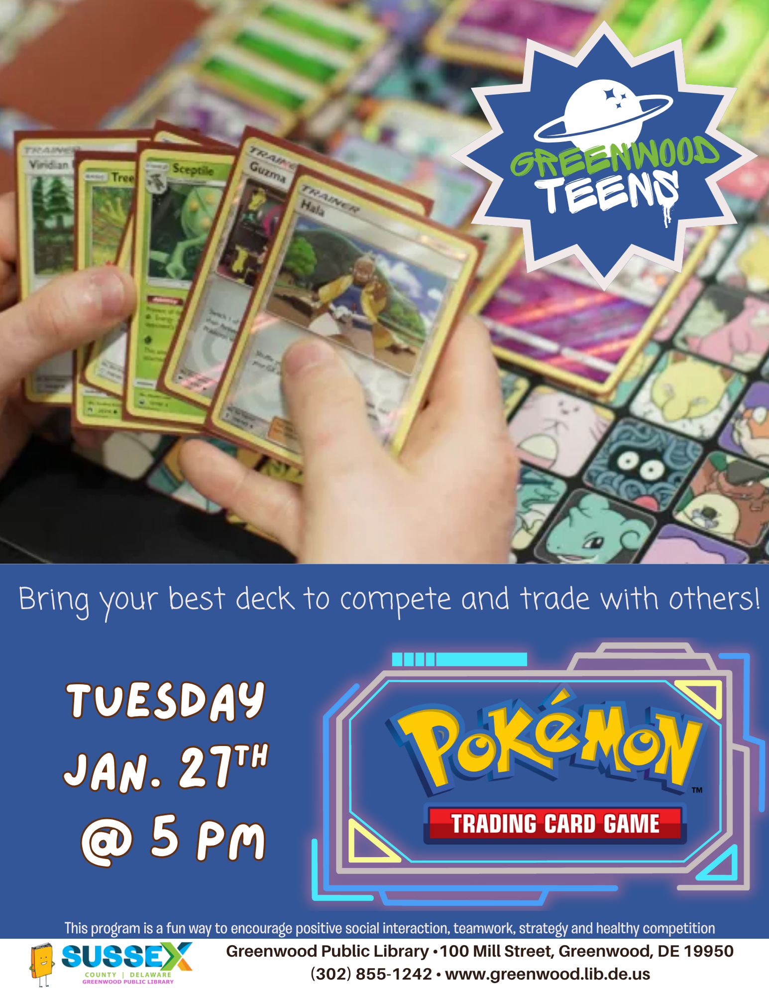 Pokemon Trading Card Game Tuesday, January 27th at 5pm Bring your best deck to the Greenwood Public Library on Tuesday, January 27th at 5pm to compete and trade with others in the Pokemon Trading Card Game! Inappropriate language and behavior will not be tolerated. Ages 10-17. For more information call 302-855-1242. No registration required. This program is a fun way to encourage positive social interaction, teamwork, strategy and healthy competition