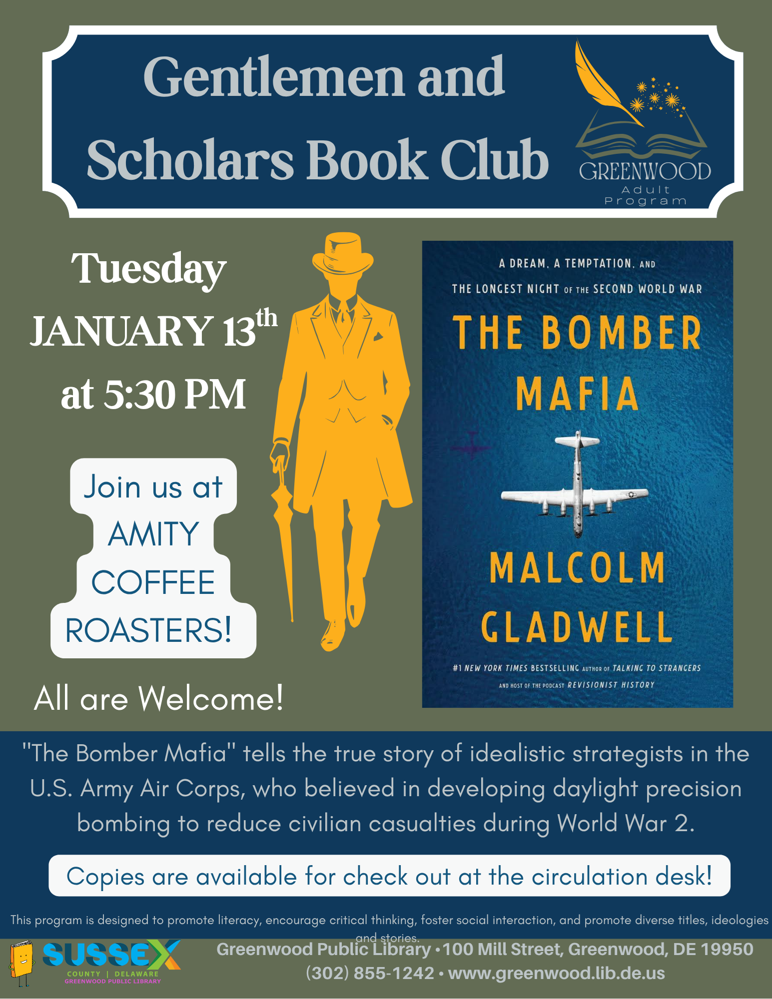 Gentlemen and Scholars - The Bomber Mafia Tuesday, January 13th at 5:30pm Join the Gentlemen and Scholars Book Club at Amity Coffee Roasters on Tuesday, January 13th at 5:30pm. This is a club for Gentlemen and Scholars ages 18+ to discuss books and the ideas within them. This month we will be discussing "The Bomber Mafia" by Malcolm Gladwell. "The Bomber Mafia" tells the true story of idealistic strategists in the U.S. Army Air Corps, who believed in developing daylight precision bombing to reduce civilian casualties during World War 2. Copies will be available at the library. For more info call 302-855-1242. This program is designed to promote literacy, encourage critical thinking, and foster social interaction.